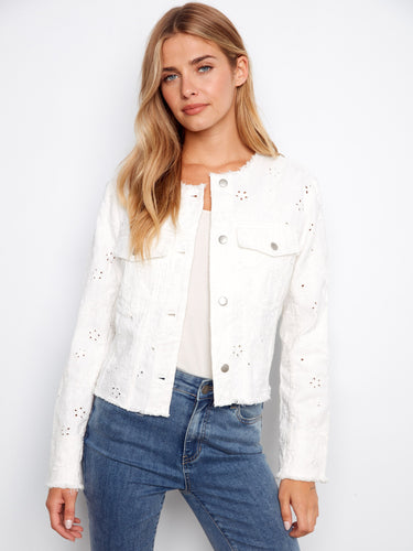A denim standout designed to elevate your style, featuring intricate eyelet embroidery that adds texture and dimension to the crisp white fabric. This women’s jacket is perfect for effortless layering, making it a versatile addition to any wardrobe.