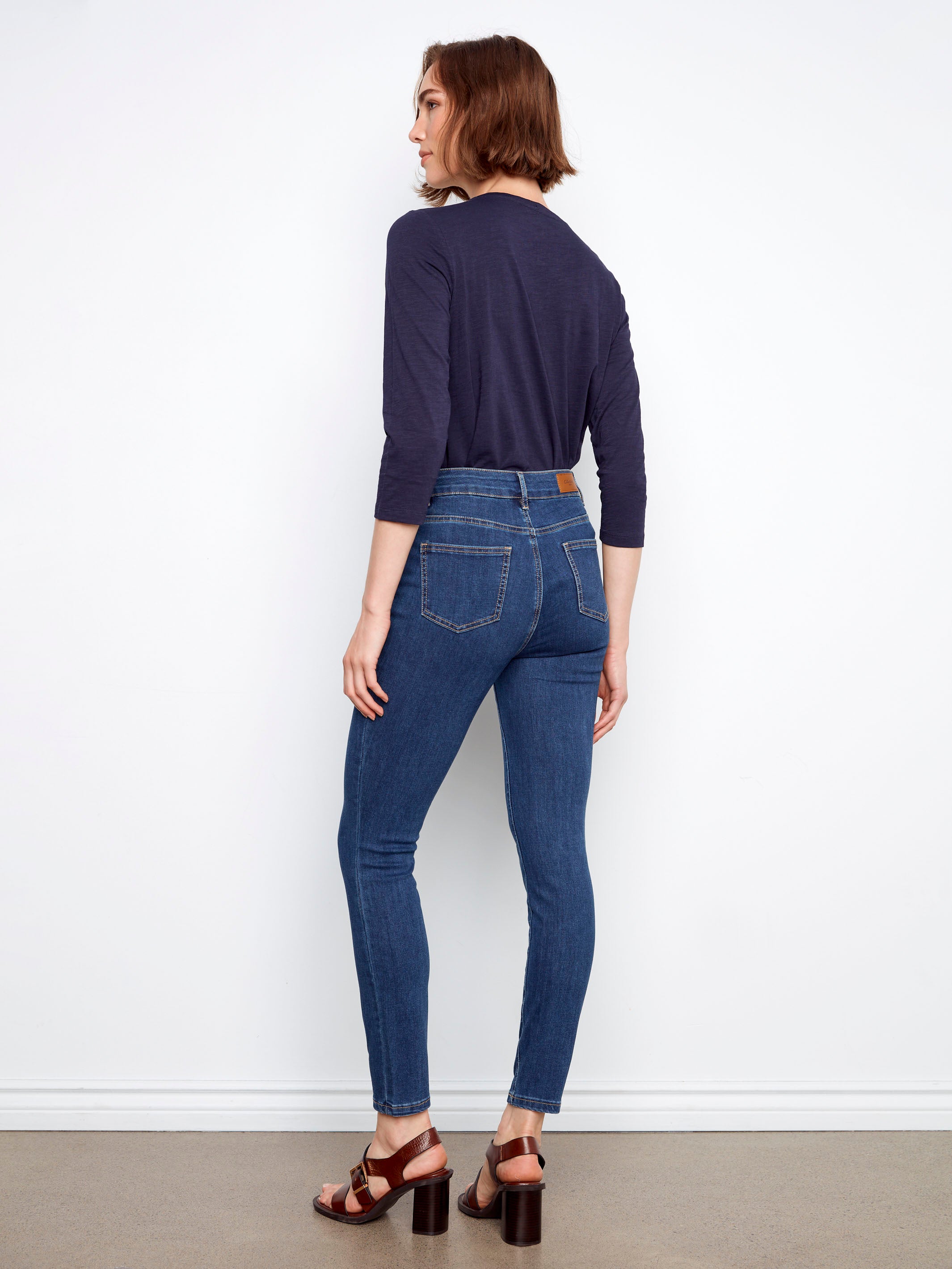 Slip into these stylish Carine skinny jeans in Indigo blue and elevate your everyday style. Featuring a flattering fit, they offer versatility, effortlessly transitioning from day to night. Perfect for pairing with a chic blouse or a casual tee, these skinny jeans for women are the ultimate spring wardrobe staple you've been searching for. A timeless pair of indigo jeans —they bring classic depth and a sleek silhouette to any outfit.