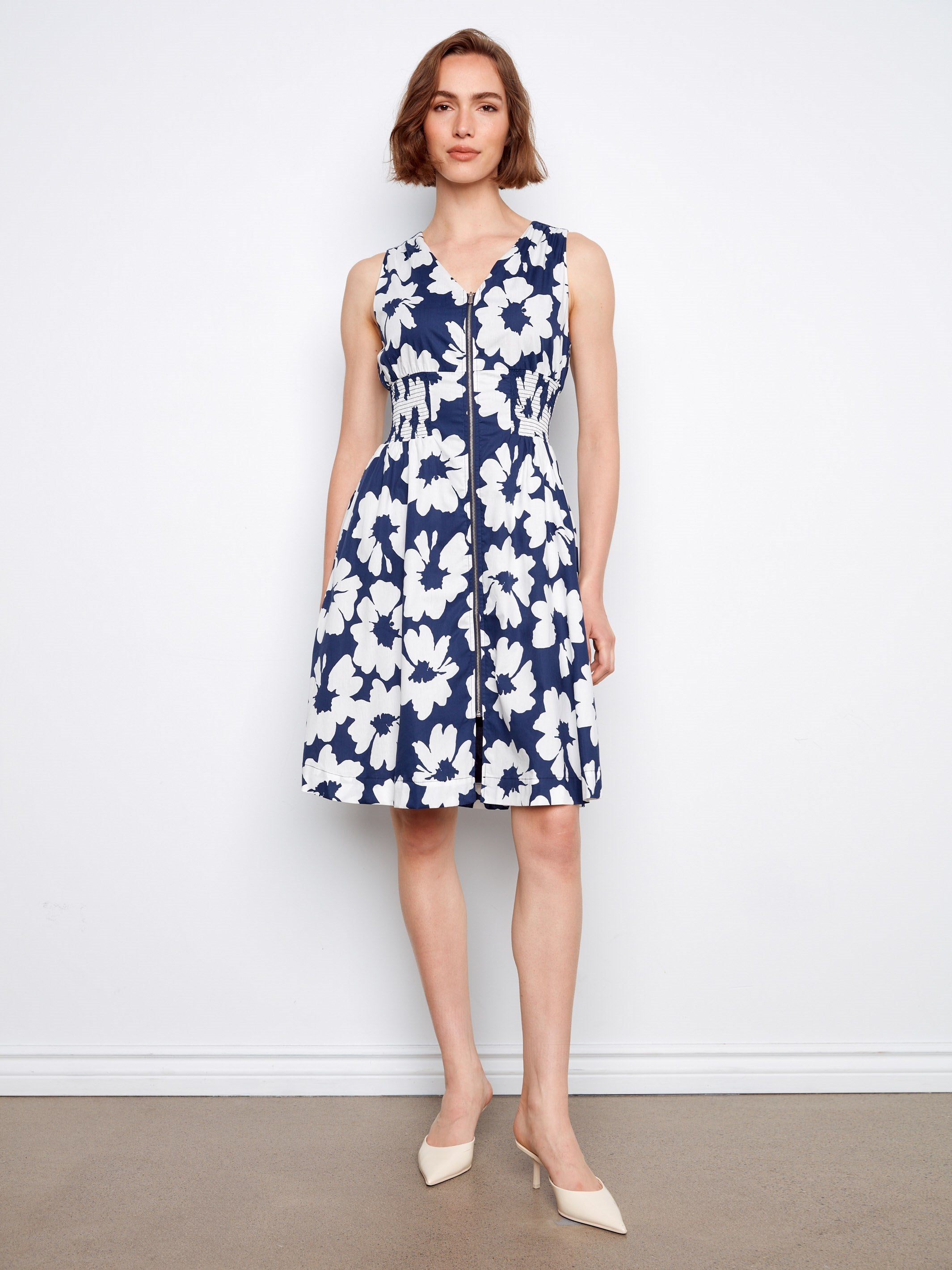 Step into the spring season with this floral dress, designed to blend effortless style with everyday comfort. The sleeveless silhouette and flattering V-neckline create a look that feels both relaxed and refined. Finished with a knee-length cut and a practical front zip closure, it’s a versatile piece suited for any occasion.