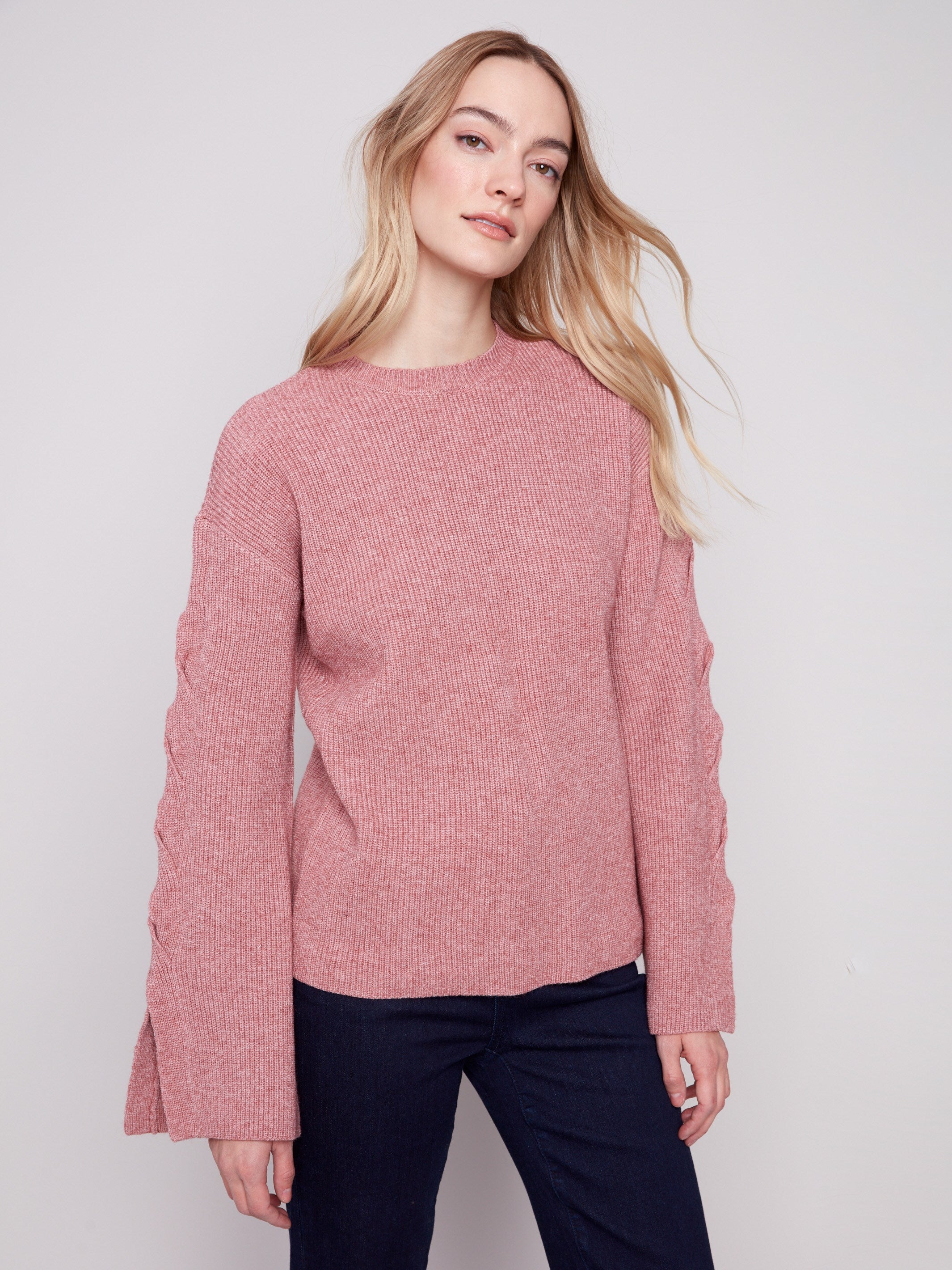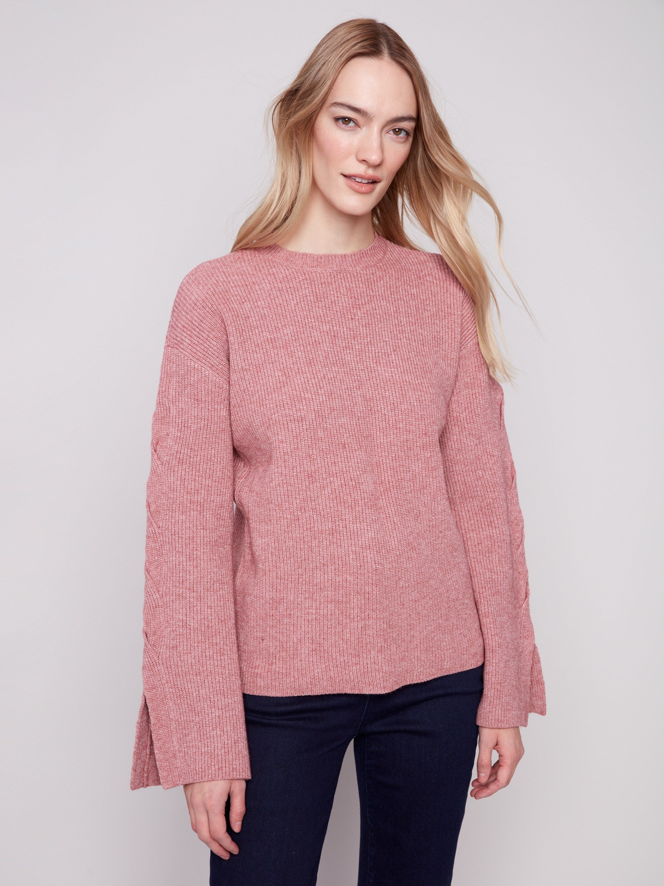 Crew Neck Sweater With Cable Sleeve Detail - Heather Primrose