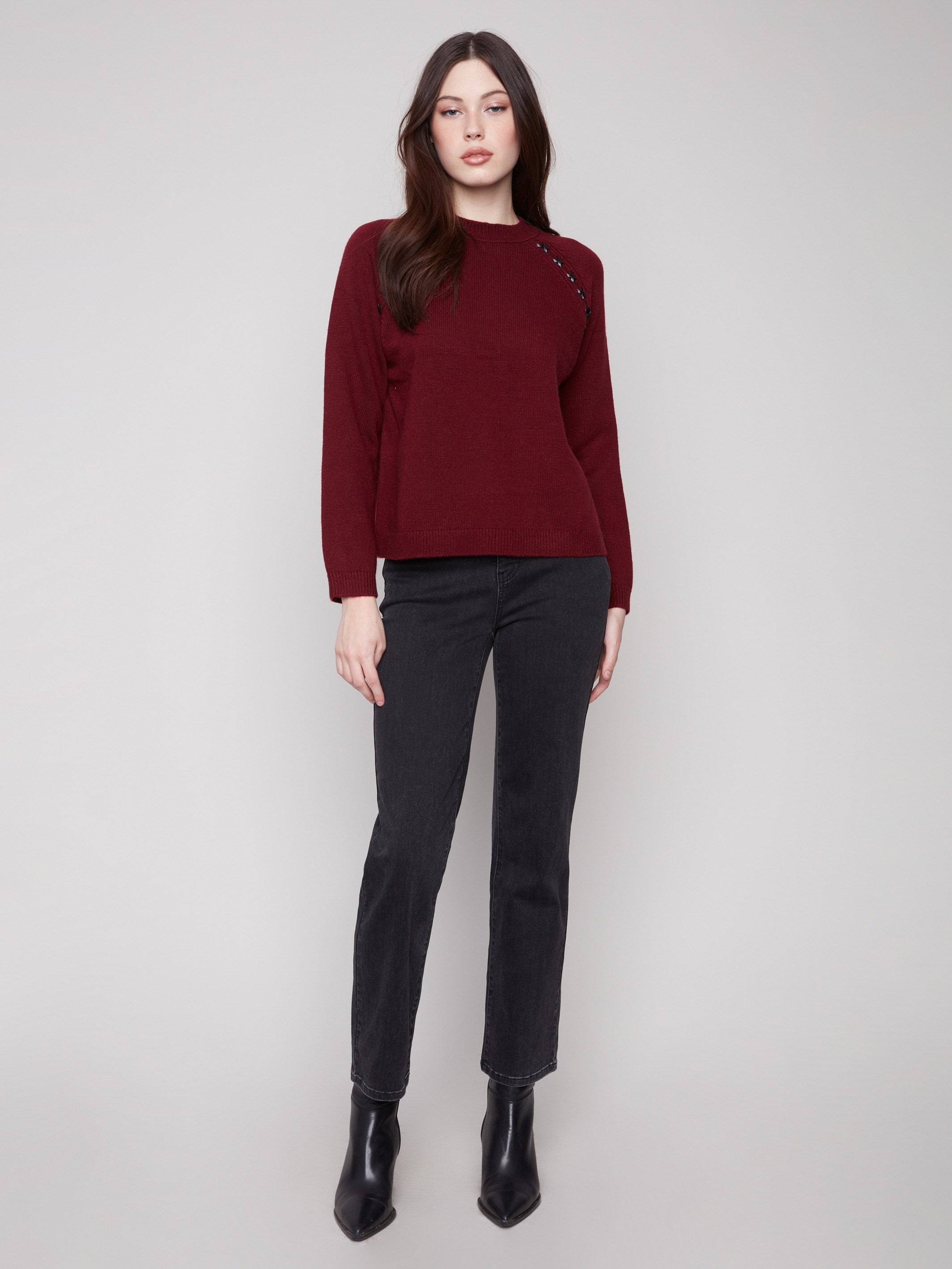 Crew Neck Sweater With Faux Leather Detail - Cabernet