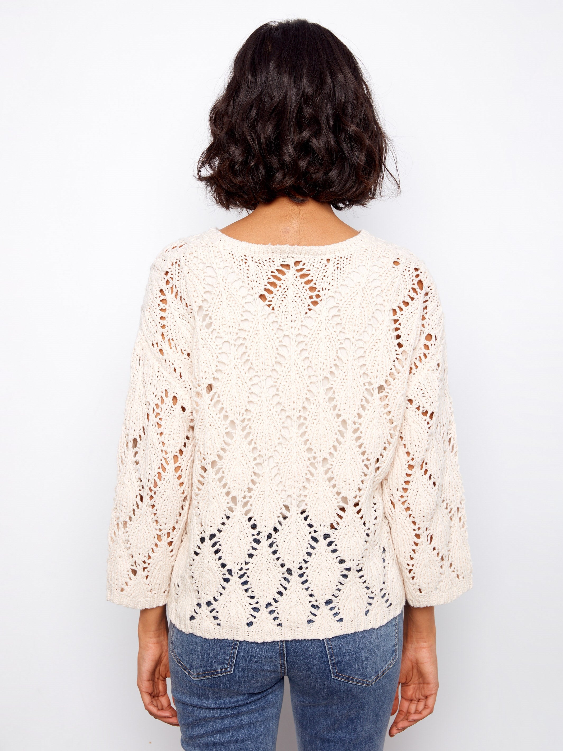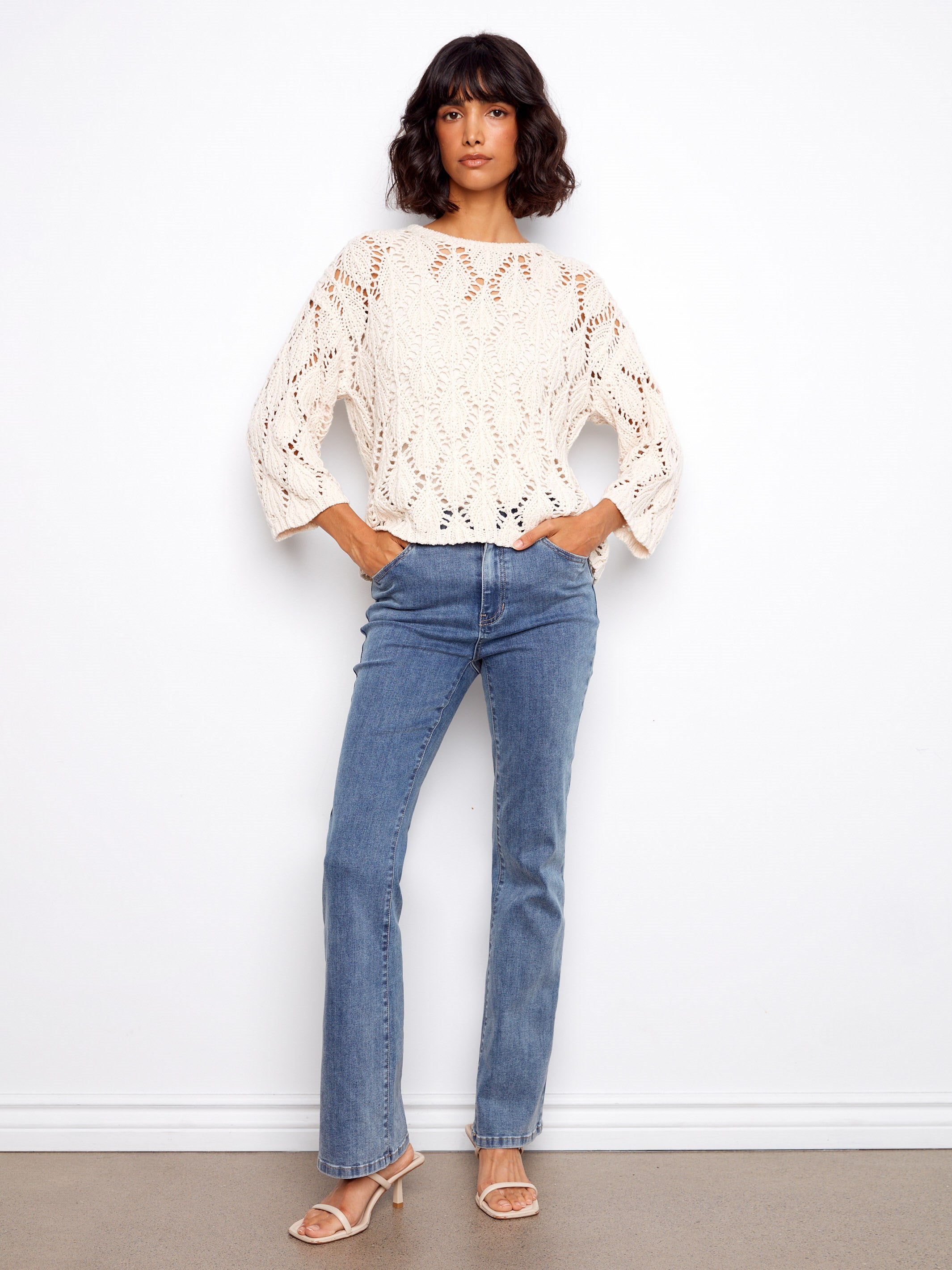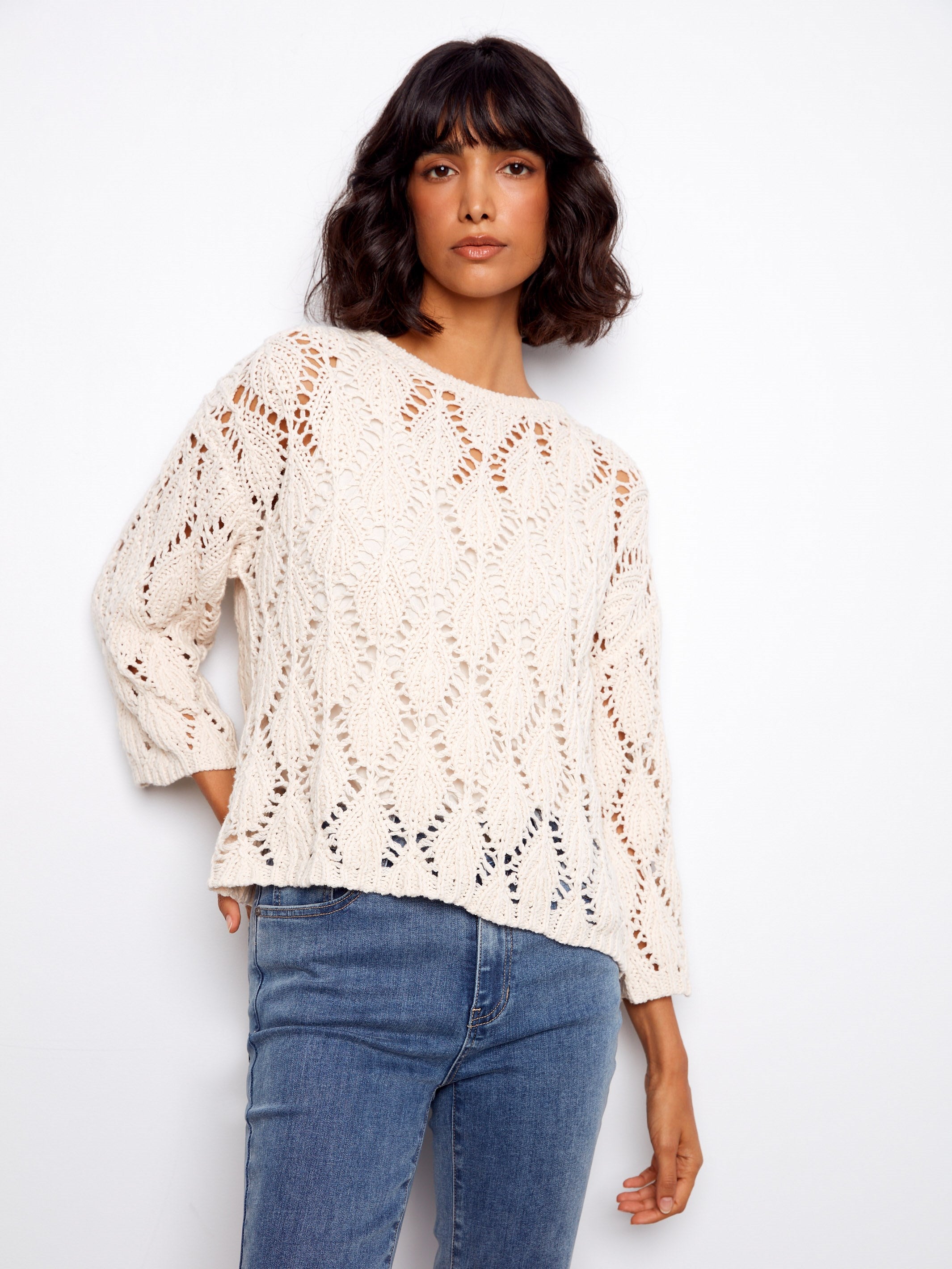 Elevate your look with our natural beige crochet crew neck sweater, designed with delicate crochet detailing for added texture. The 3/4 sleeves provide lightweight comfort, making it ideal for layering throughout the season. Refresh your spring-summer wardrobe with this versatile cotton-blend sweater.