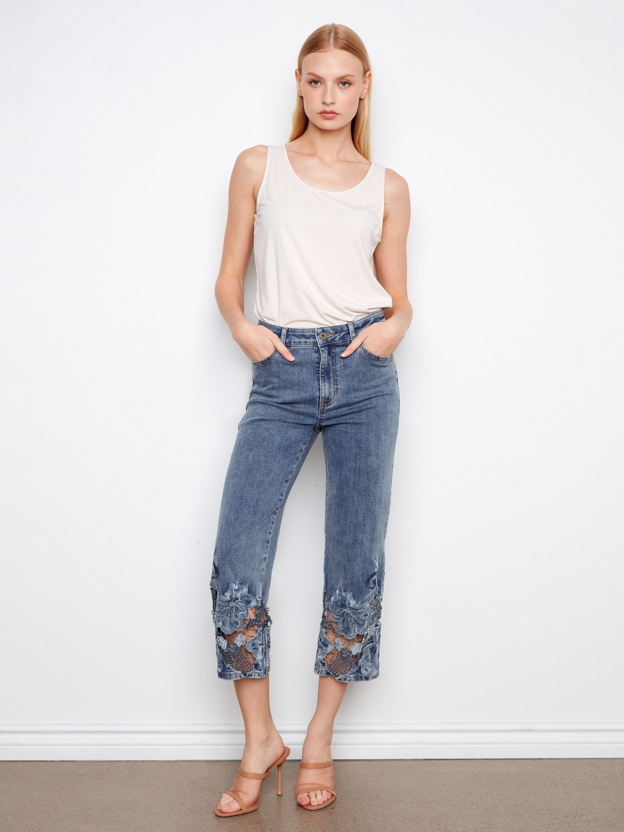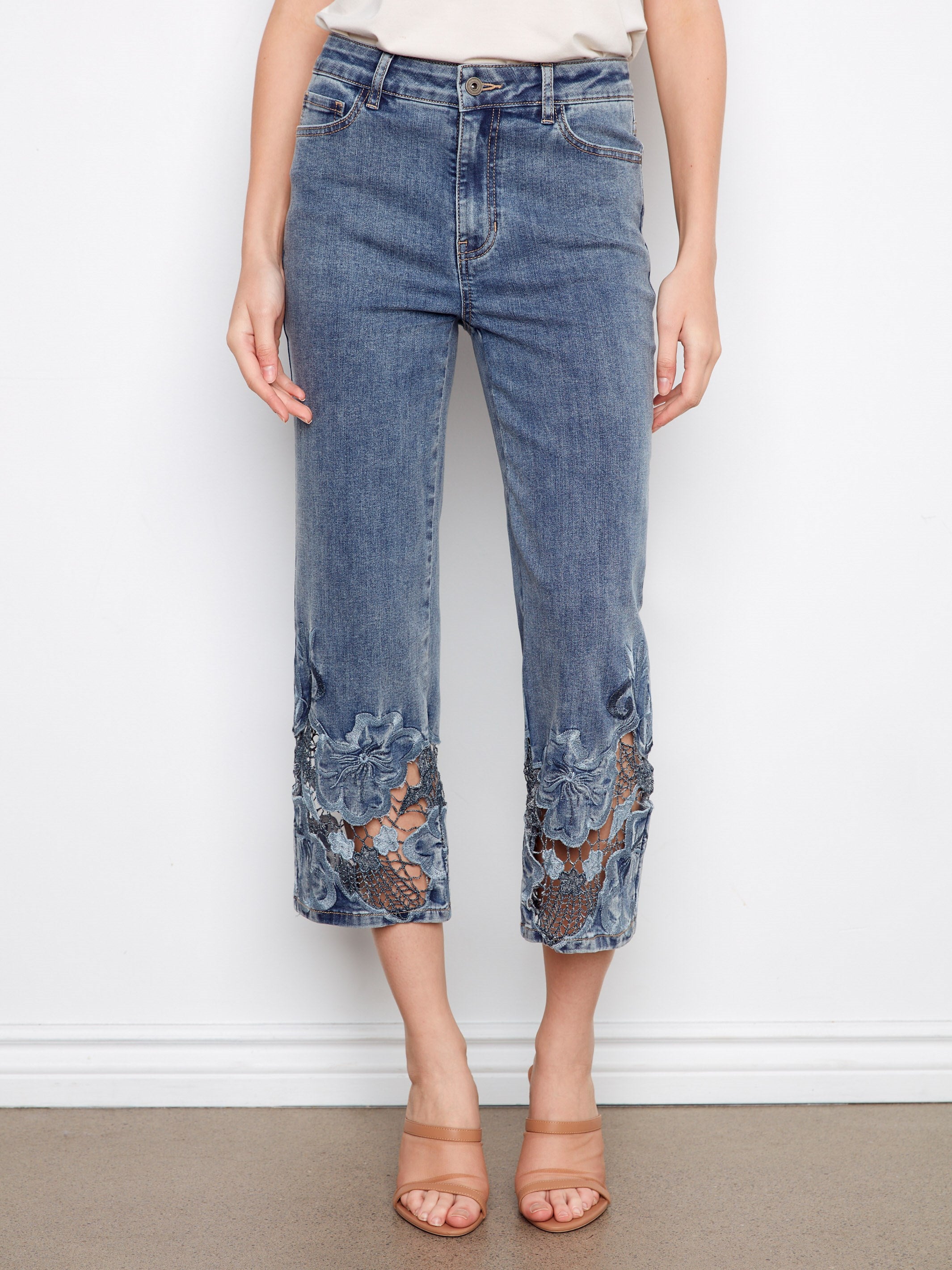 Discover a modern update to classic denim with our medium blue cropped flare jeans. Delicate lace embroidery at the hem adds refined detail, while the timeless five-pocket design keeps the look versatile and wearable. Effortlessly stylish, this distinctive pair brings a fresh edge to your everyday wardrobe.