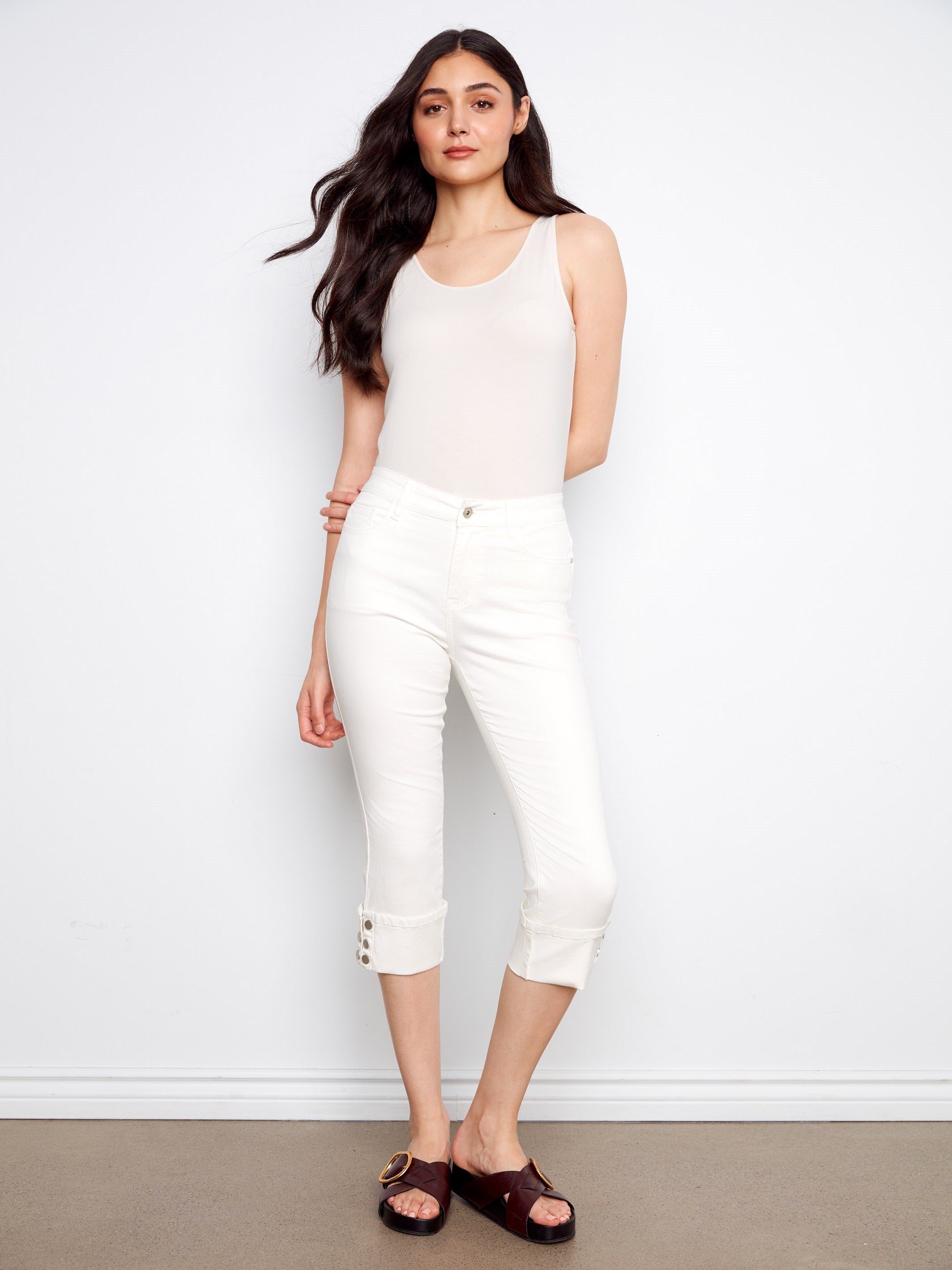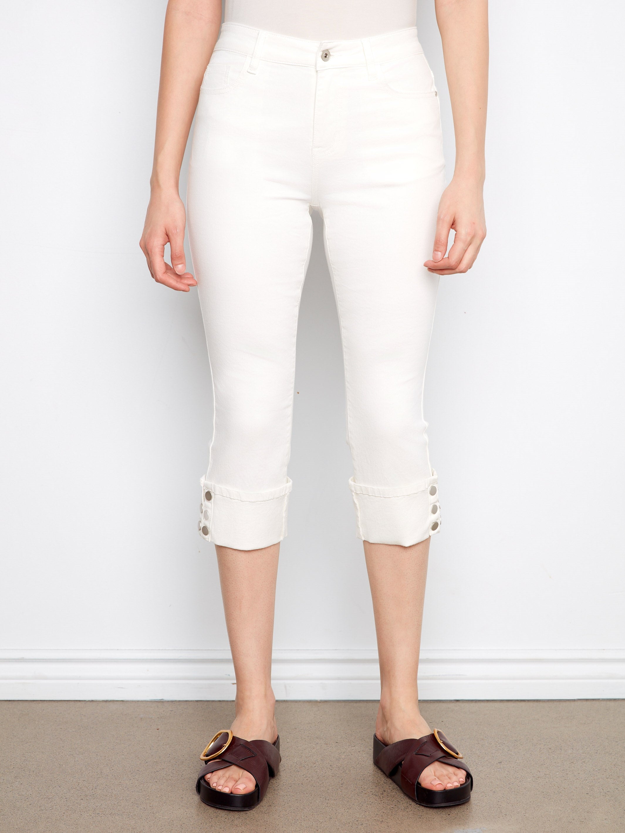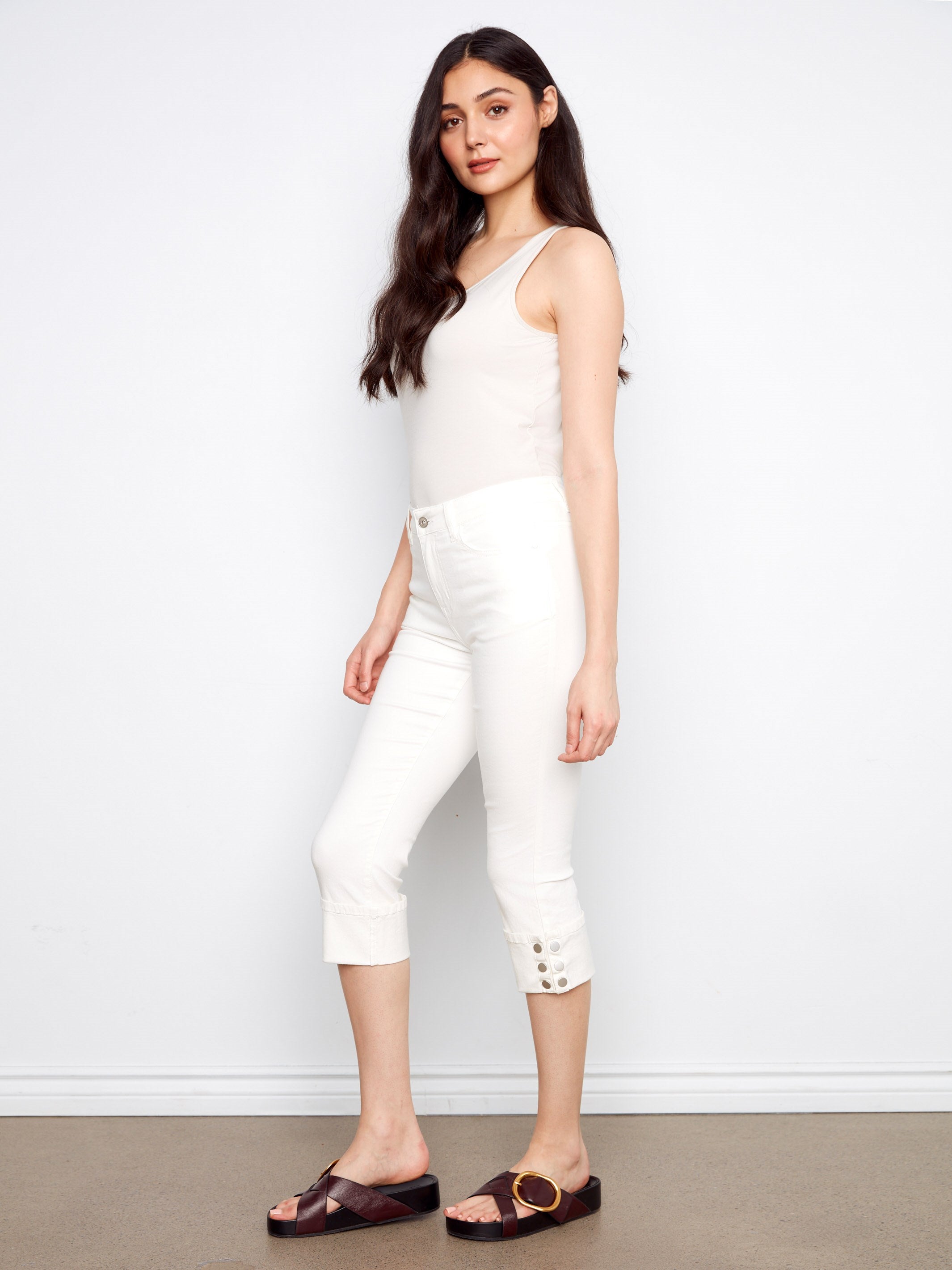 Refresh your everyday wardrobe with our white cropped twill jeans, designed to elevate your style effortlessly. These jeans feature a sleek narrow leg and trendy snap button cuffs, offering both fashion-forward appeal and versatility. Pair them with sandals or sneakers to achieve a chic, minimalist look perfect for any casual outing.
