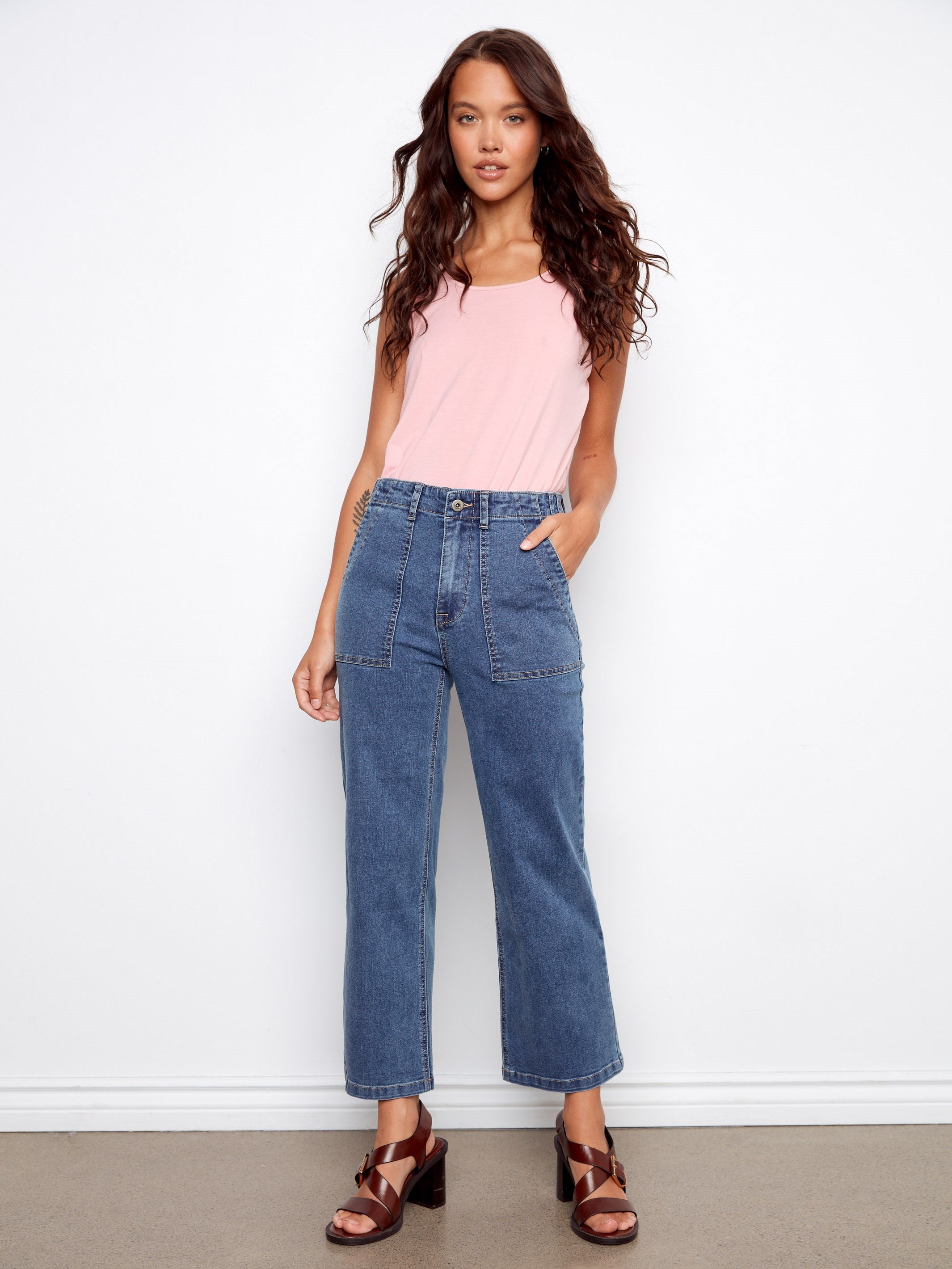 Transform your casual spring wardrobe with our Cropped Utility Pocket Jeans, expertly crafted in a stretchy denim fabric for unmatched comfort and flair. Their versatile medium blue color seamlessly complements any top, making these jeans the ultimate choice for a laid-back day out.