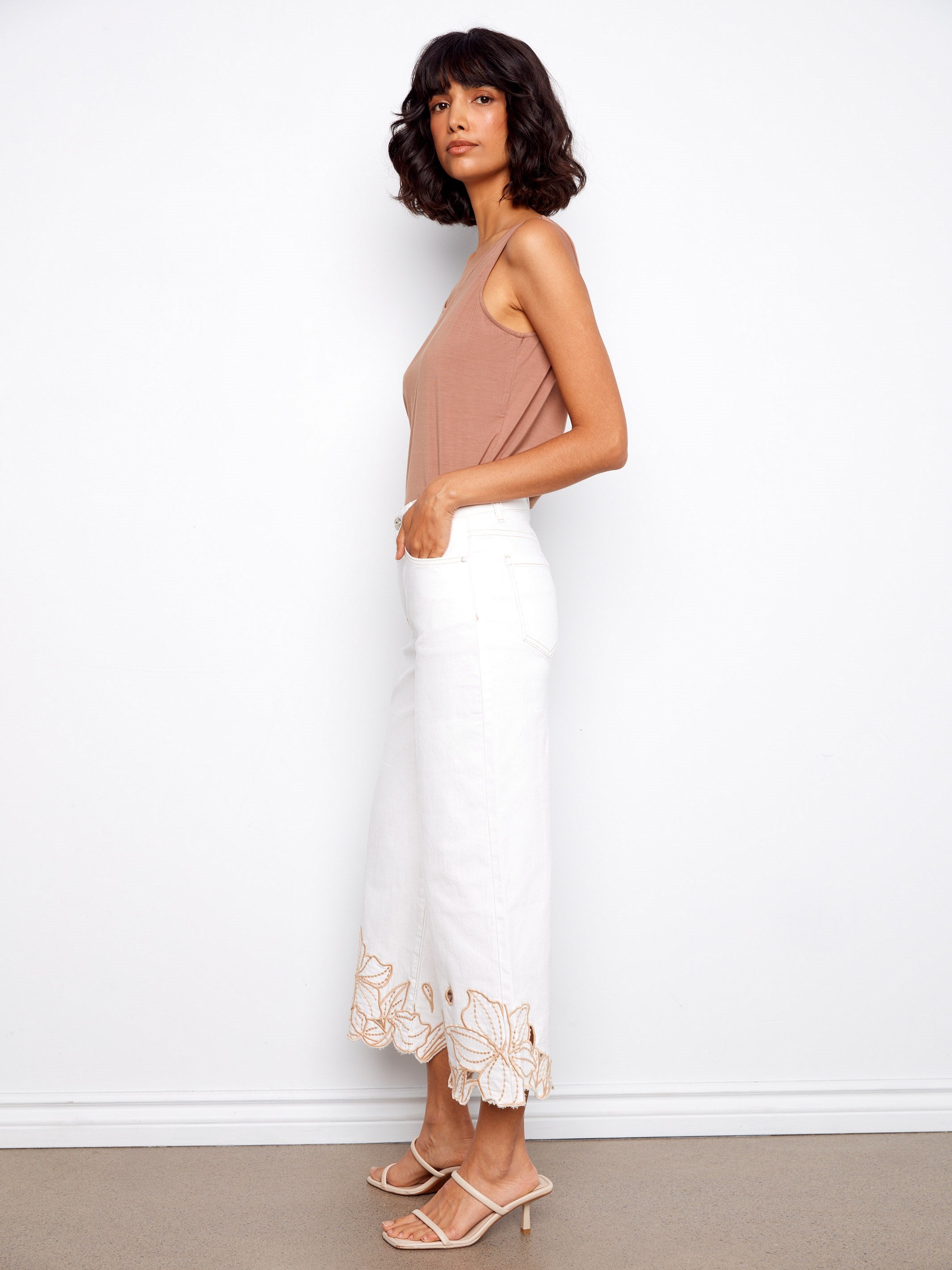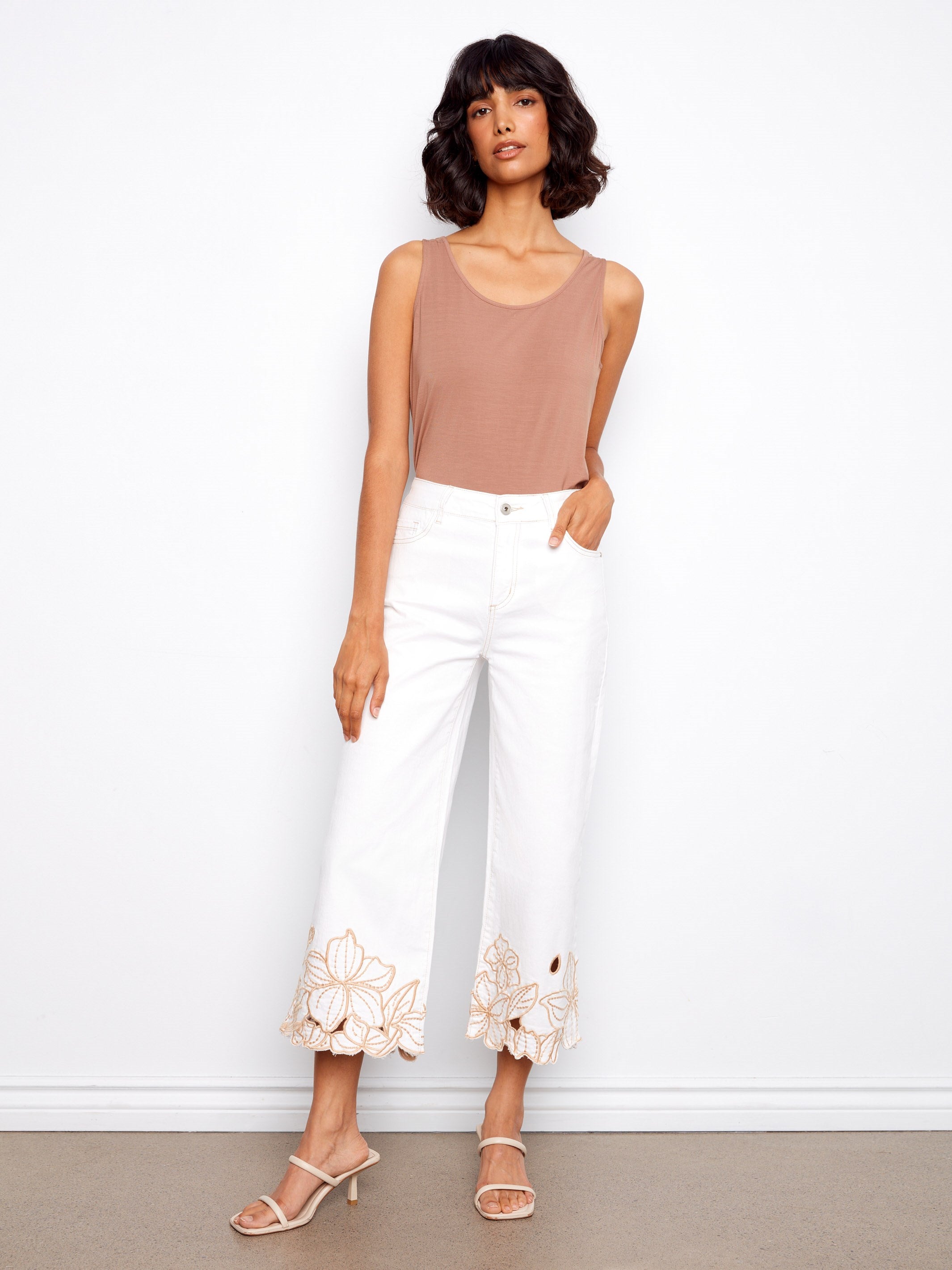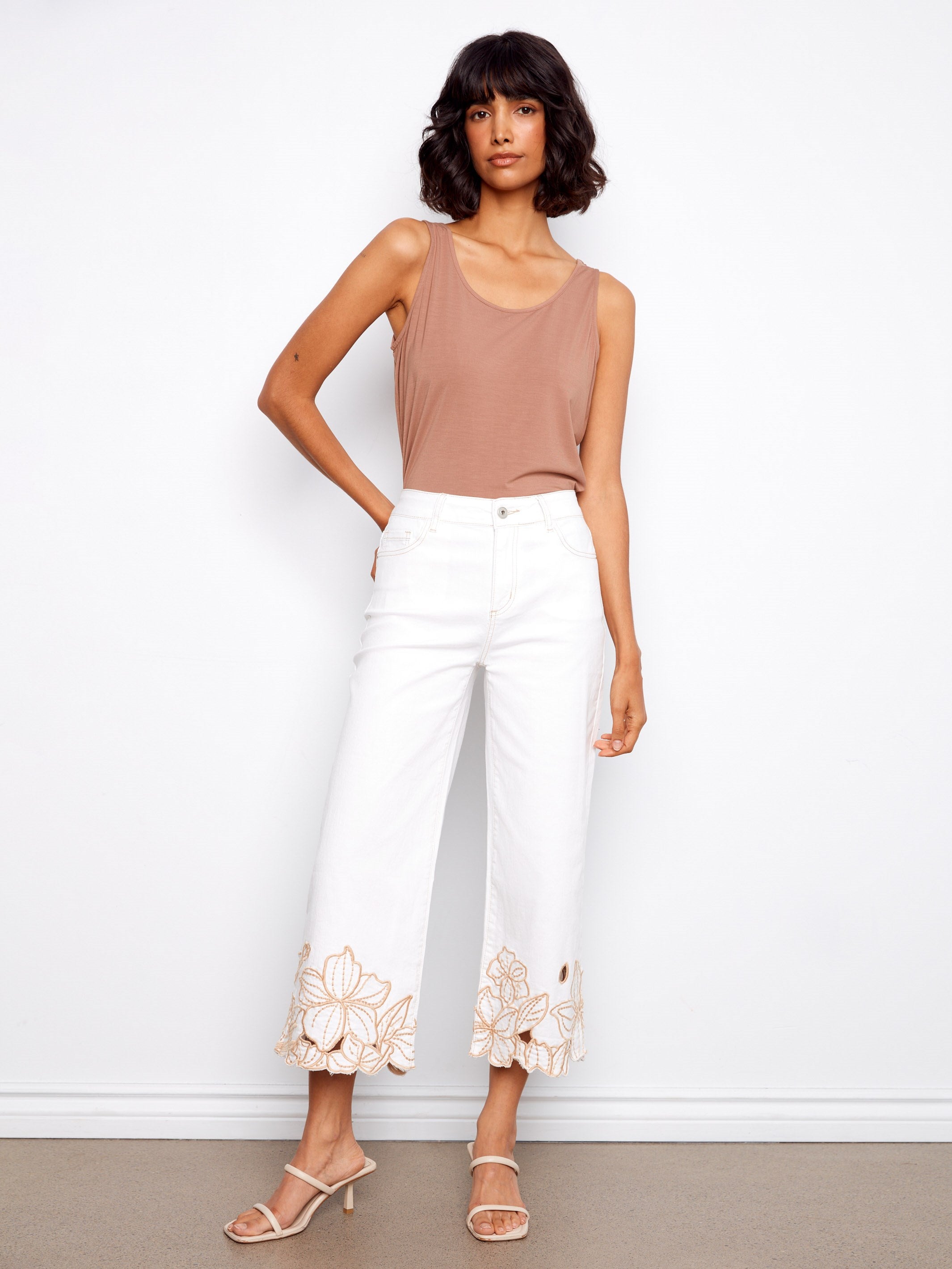 Discover effortless elegance with our cropped wide leg twill jeans, adorned with intricate floral embroidery for a playful touch. Perfect for casual days or dressier occasions, these jeans combine beautiful detailing with a comfortable fit, making them your new go-to piece for every event. Elevate your spring wardrobe with this versatile favorite that promises to turn heads.