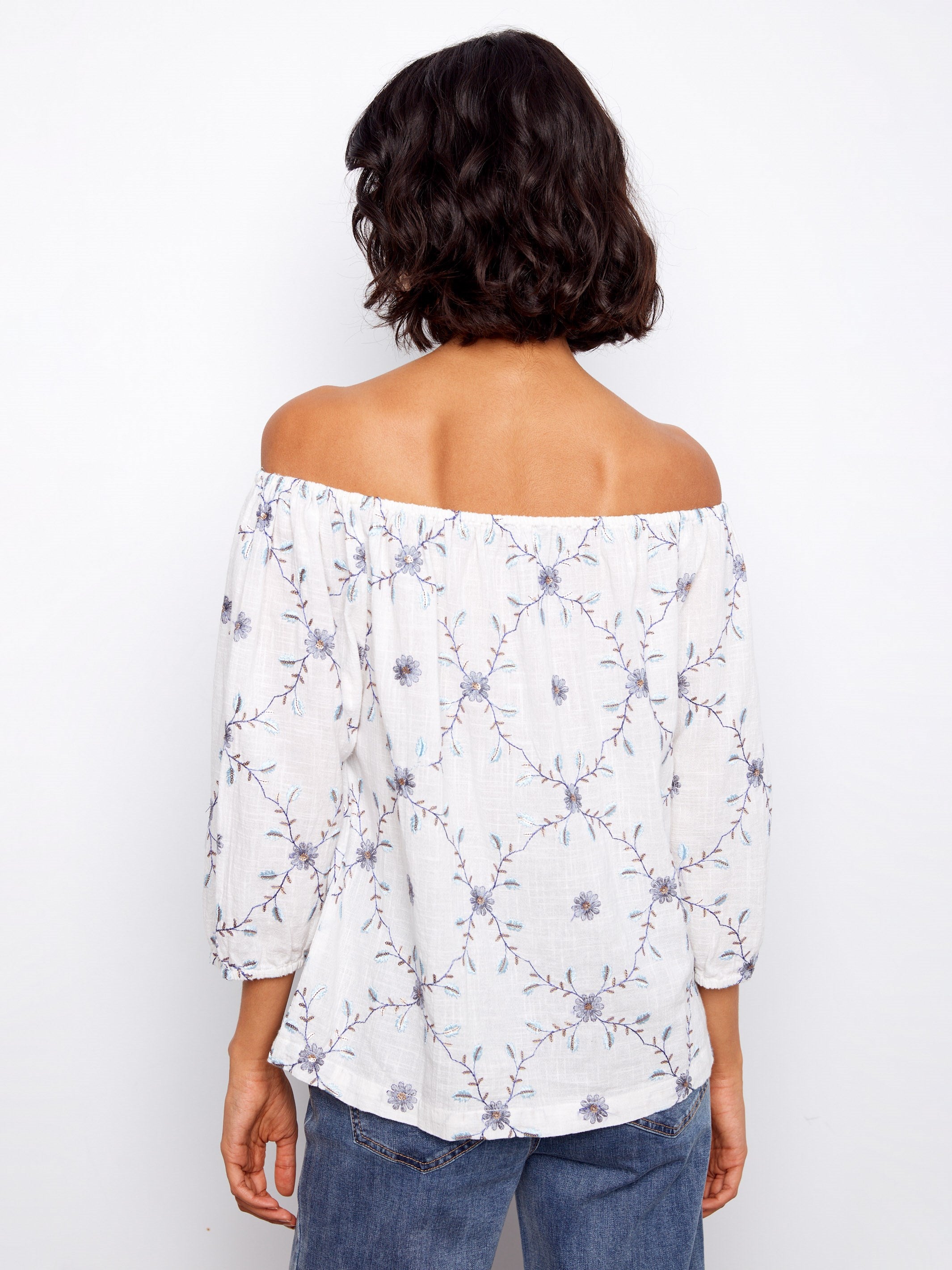 Step into the sunshine with this off-shoulder blouse, delicately adorned with floral embroidery for a touch of romantic charm. Crafted from crisp and breathable cotton, it keeps you cool. Its versatile silhouette pairs beautifully with your favorite jeans or a flowing skirt, making it a must-have for the spring-summer season.