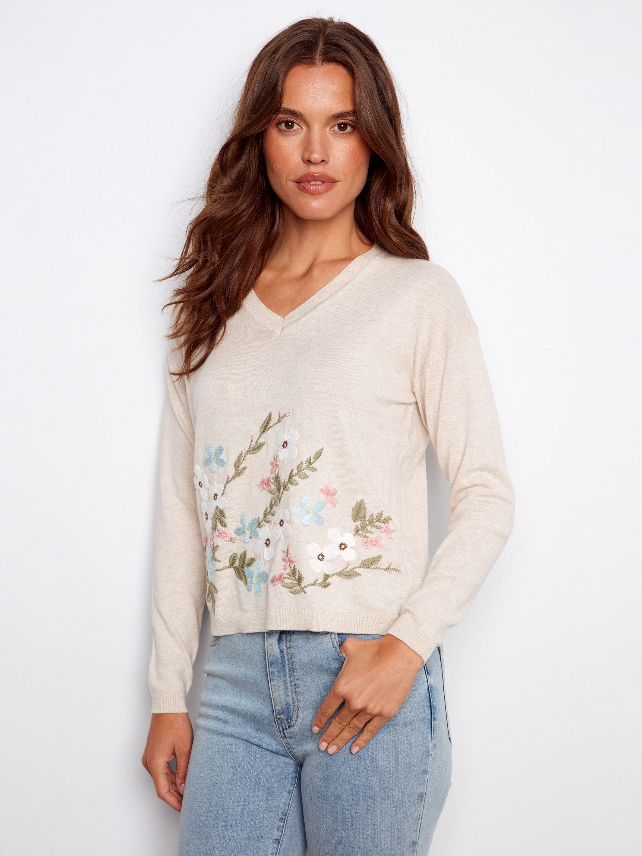Discover our V-neck sweater adorned with delicate floral embroidery. Crafted from soft, breathable cotton, it offers timeless style you can wear in any season. Perfect for both casual and dressed-up occasions, this sweater is sure to become a staple in your spring wardrobe. Elevate your look with this versatile essential today.