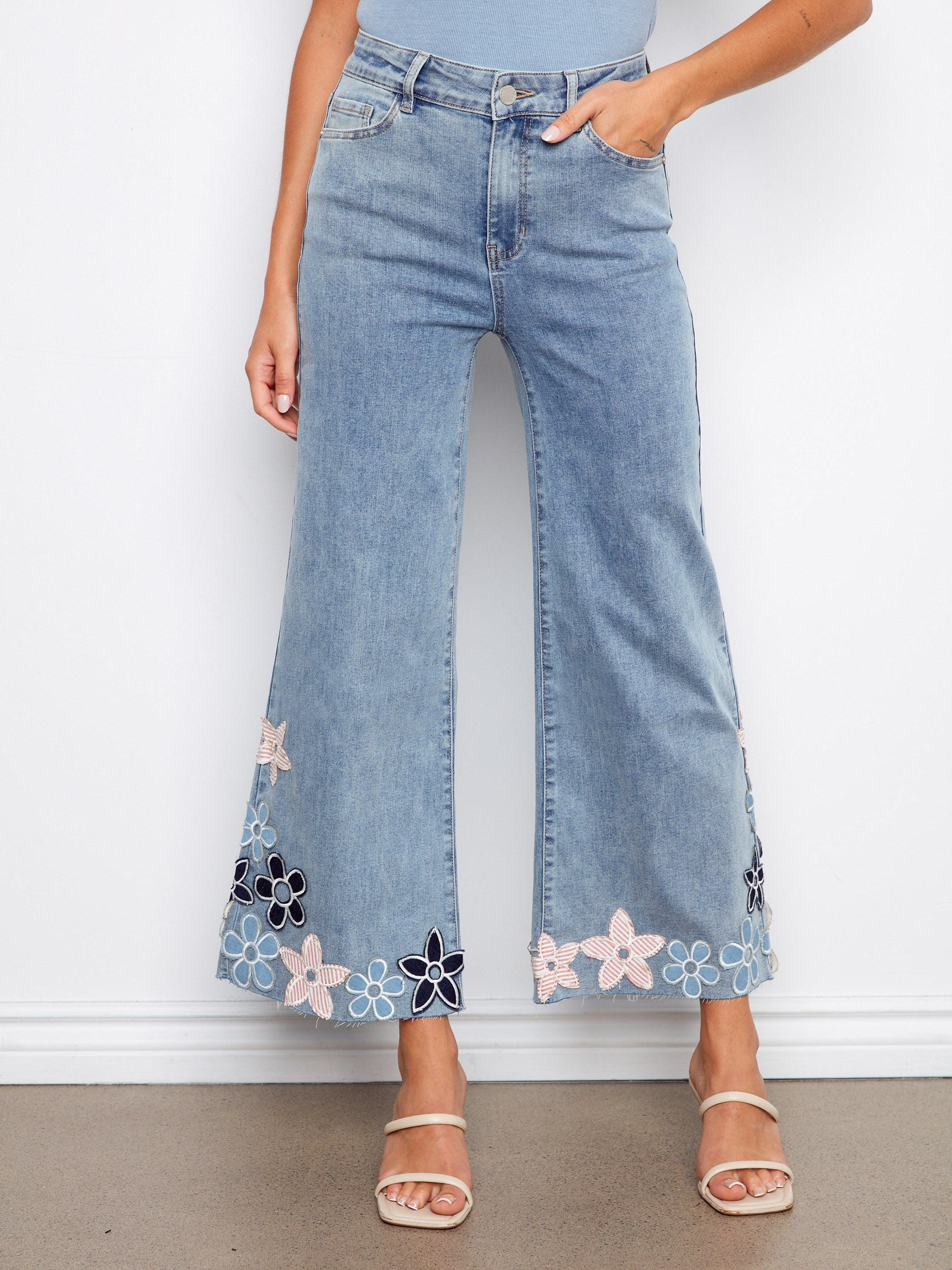Refresh your spring style with our light blue cropped flare jeans, detailed with delicate floral embroidery and finished with a chic raw hem for a modern edge. Crafted from soft stretch denim, they offer a flattering fit with effortless comfort and a subtle touch of bohemian charm.