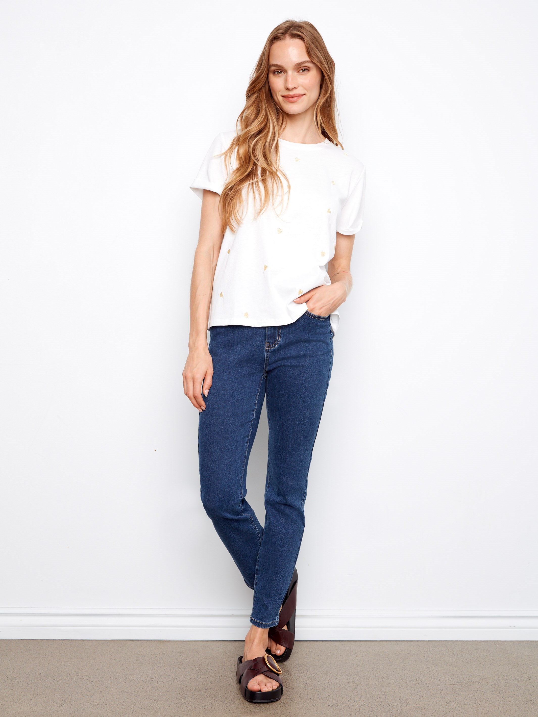 A soft cotton T-shirt decorated with charming embroidered hearts adds a dreamy touch. The intricate details bring a whimsical flair to the classic white shirt. Its relaxed fit is perfect for leisurely afternoons or snug evenings.