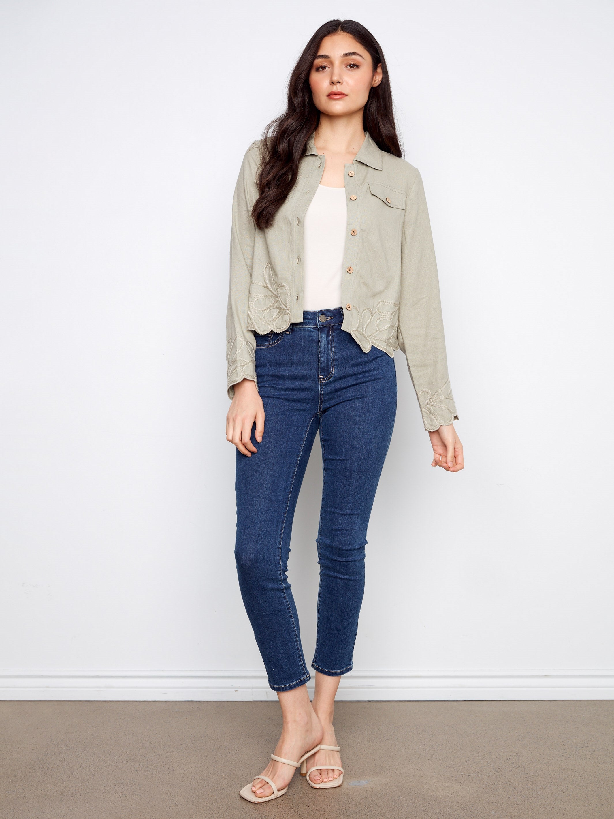 Embrace timeless style with our sage green Embroidered-Hem Linen Blend Jacket. Featuring subtle tone-on-tone embroidery and a classic button closure, this jacket exudes refined style. Made from a breathable linen blend, it offers comfort on casual outings while keeping your look polished. A versatile spring essential, it’s perfect for upgrading any wardrobe.