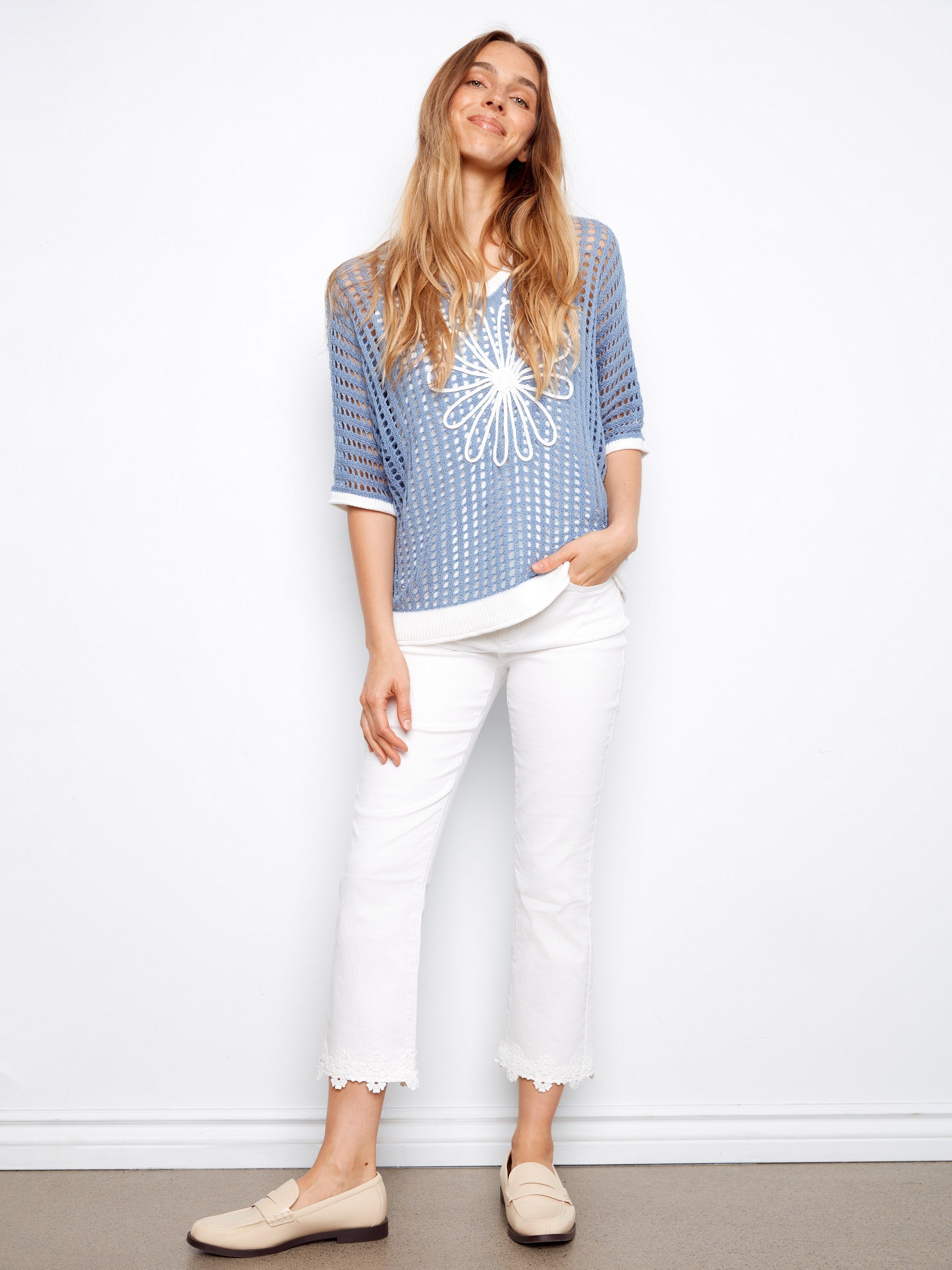 Transform your spring wardrobe with our enchanting fishnet dolman sweater in a captivating haze blue. Adorned with delicate white floral appliqué and a stylish V-neckline, it exudes a whimsical charm. Perfect for layering, this sweater is your go-to for those breezy spring days, effortlessly blending style and comfort.