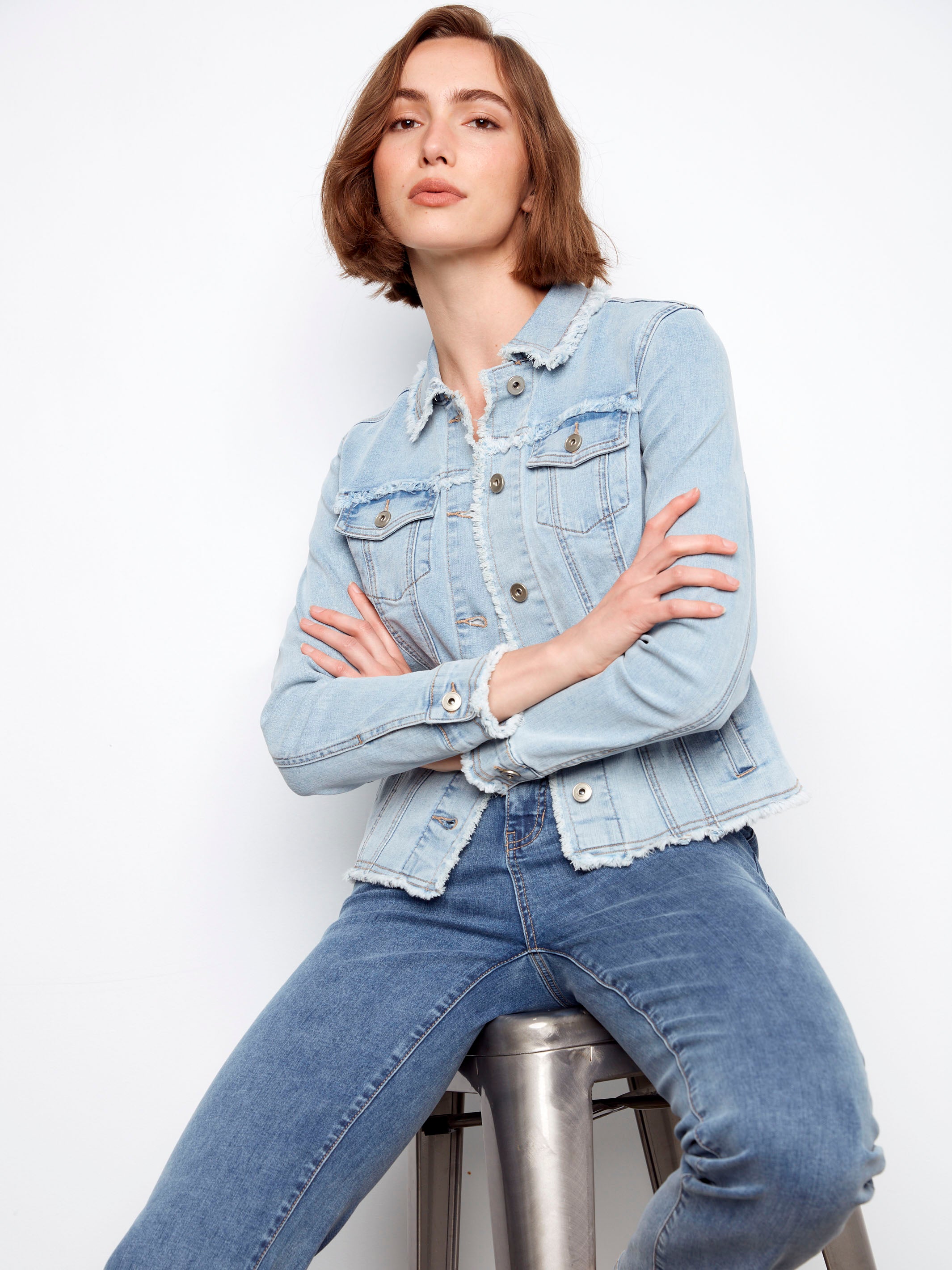 Add a little edge to your wardrobe with our bleach blue frayed edge stretch denim jacket. Designed with a classic button-front closure, flap pockets and long sleeves, it blends timeless style with modern flexibility. The stretch denim fabric ensures all-day comfort, while the frayed detailing adds a relaxed, effortlessly cool vibe. Perfect for breezy spring days or cool summer evenings.