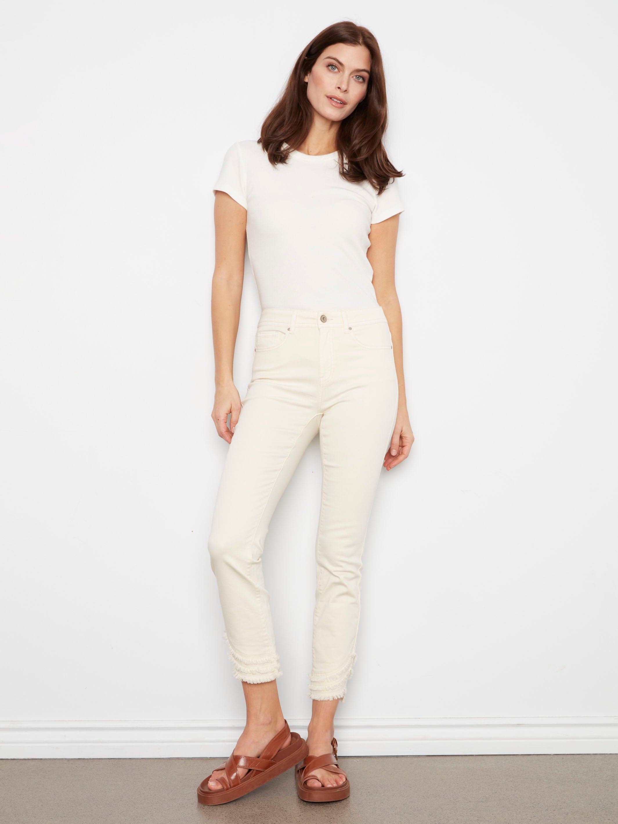 Discover the perfect mix of style and comfort with our twill pants, featuring frayed hems for an effortlessly stylish look. The soft natural off-white color, combined with stretchy fabric, ensures a comfortable and flattering fit. These pants are the ultimate addition to elevate any spring wardrobe with a trendy, modern touch.
