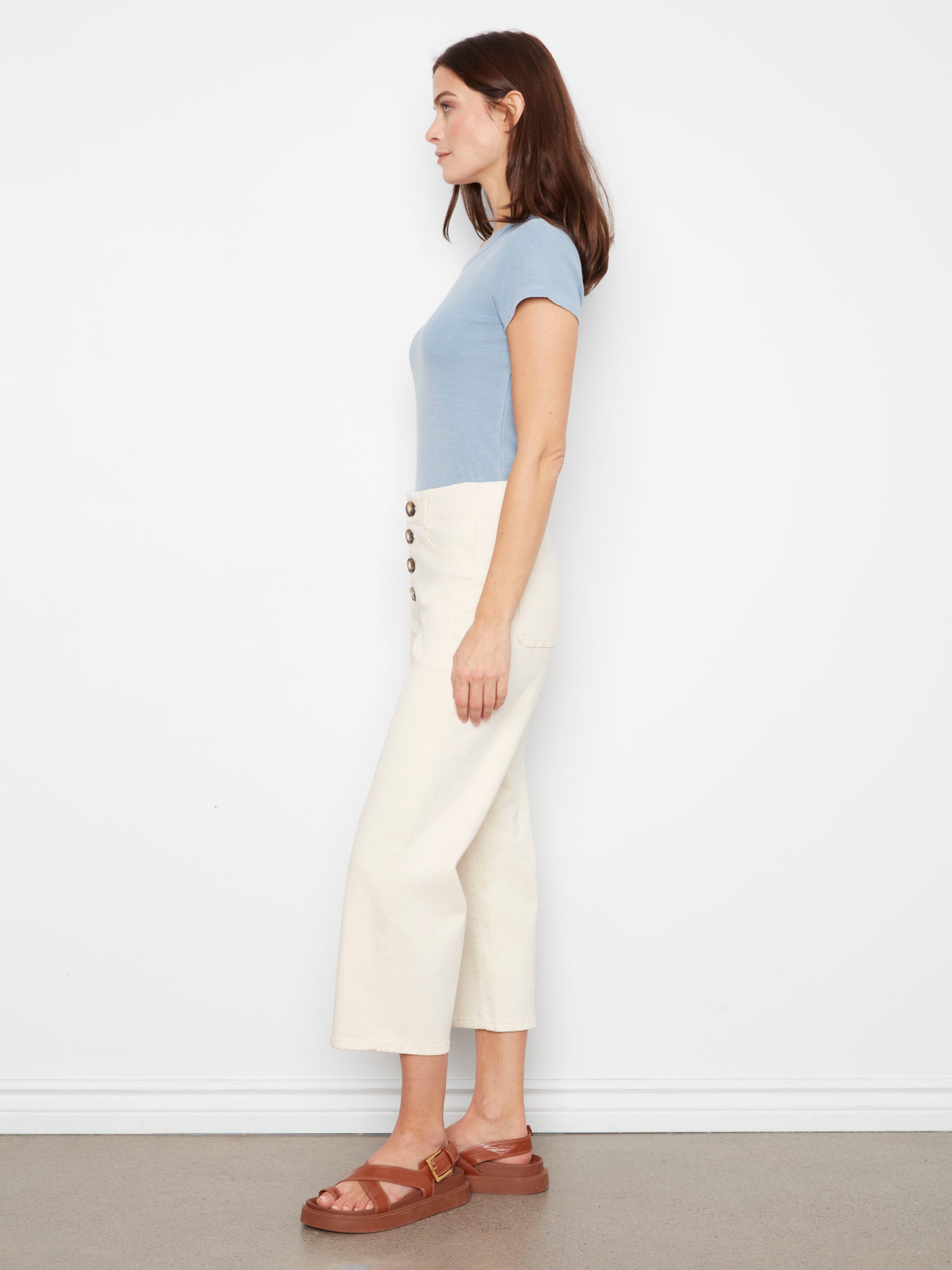 Step into effortless style with our chic cropped twill pants, perfect for any casual outing. The button fly and natural off-white color exude subtle elegance, while the practical five-pocket design adds functionality. These pants are a must-have addition to your wardrobe, offering a fresh and modern look that's perfect for any occasion.