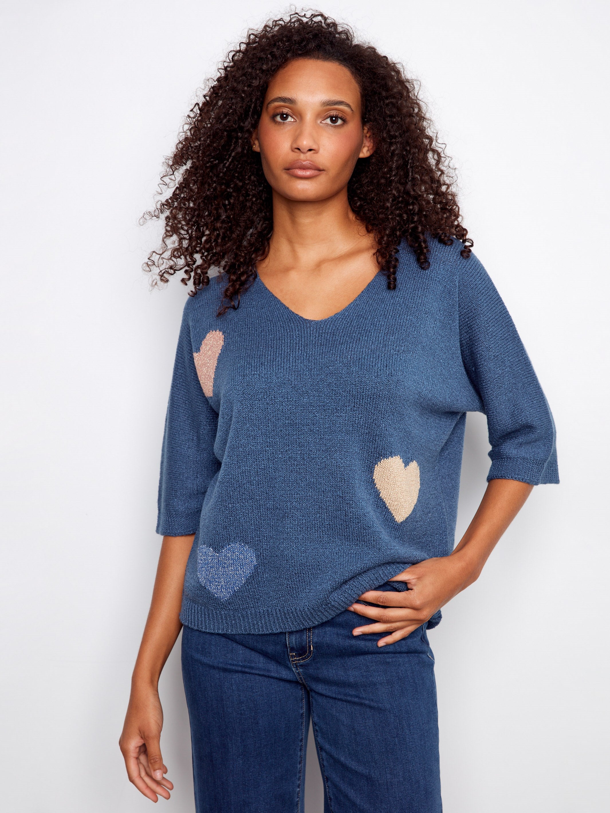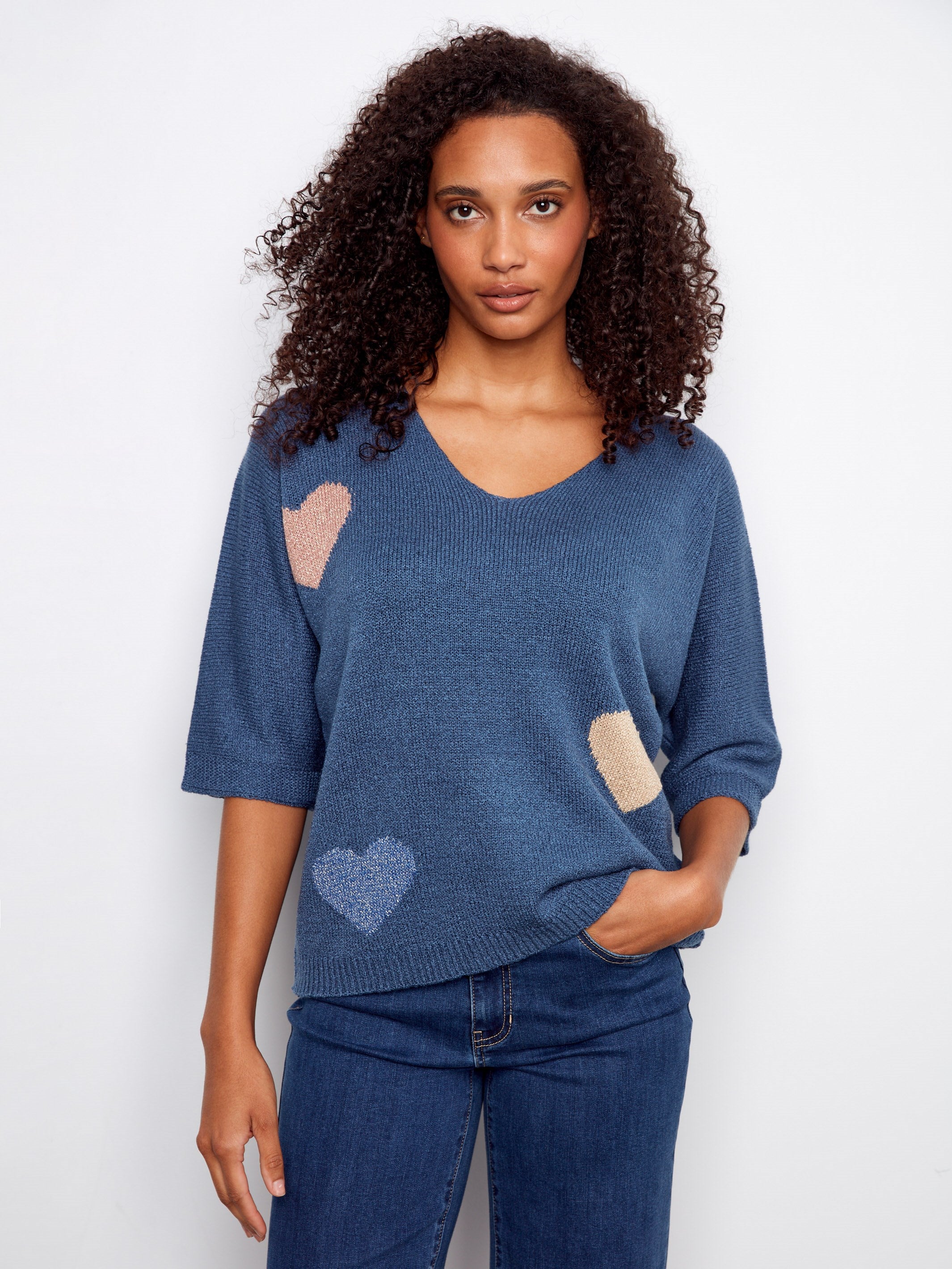Bring a playful touch to your spring wardrobe with our jacquard denim blue sweater. Featuring charming dolman sleeves that hit the elbow and elegant hearts woven with subtle lurex thread, this soft, lightweight sweater is perfect for layering during transitional seasons.