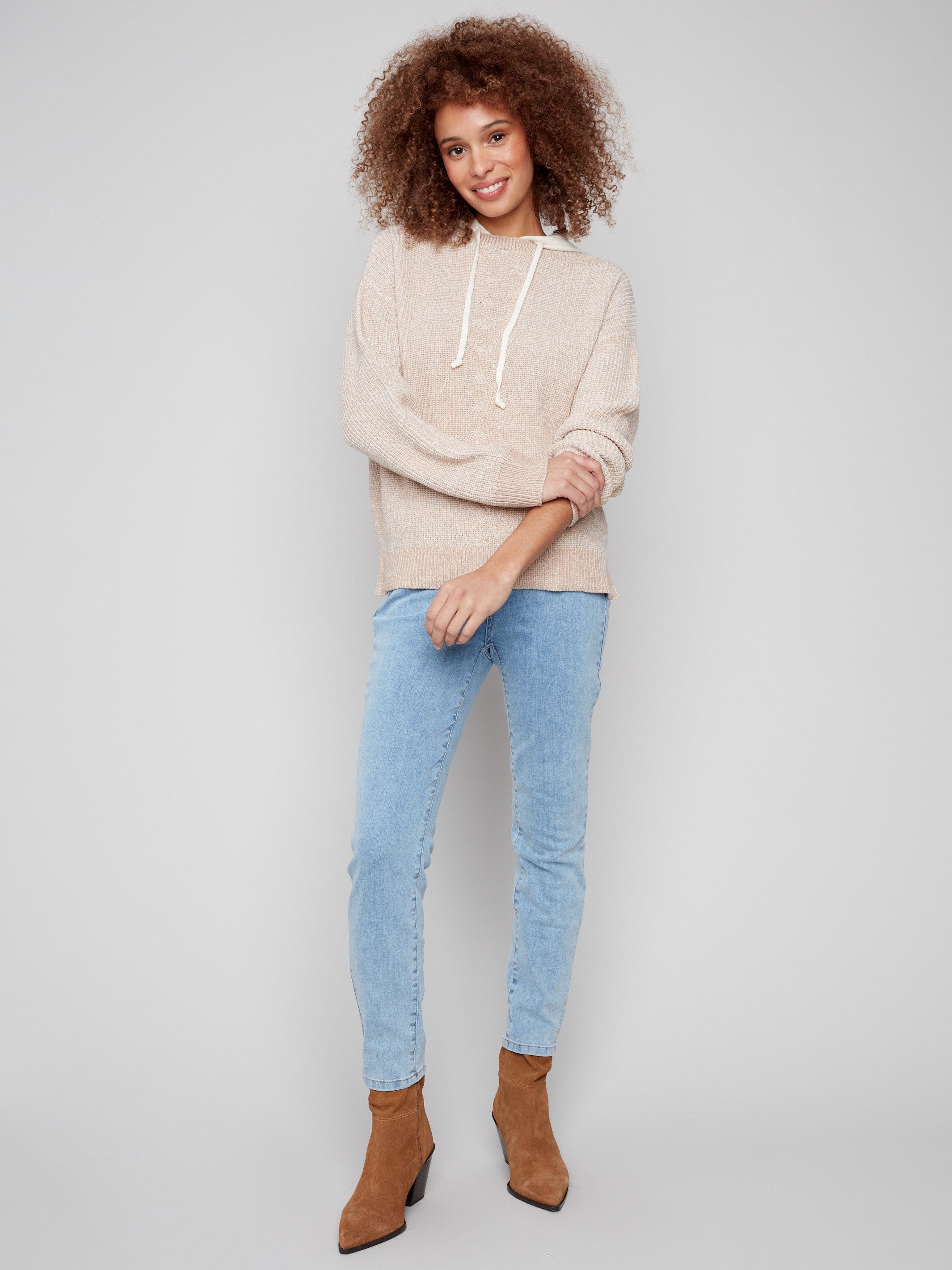 Hoodie Sweater With Front Cable Detail - Heather Sesame