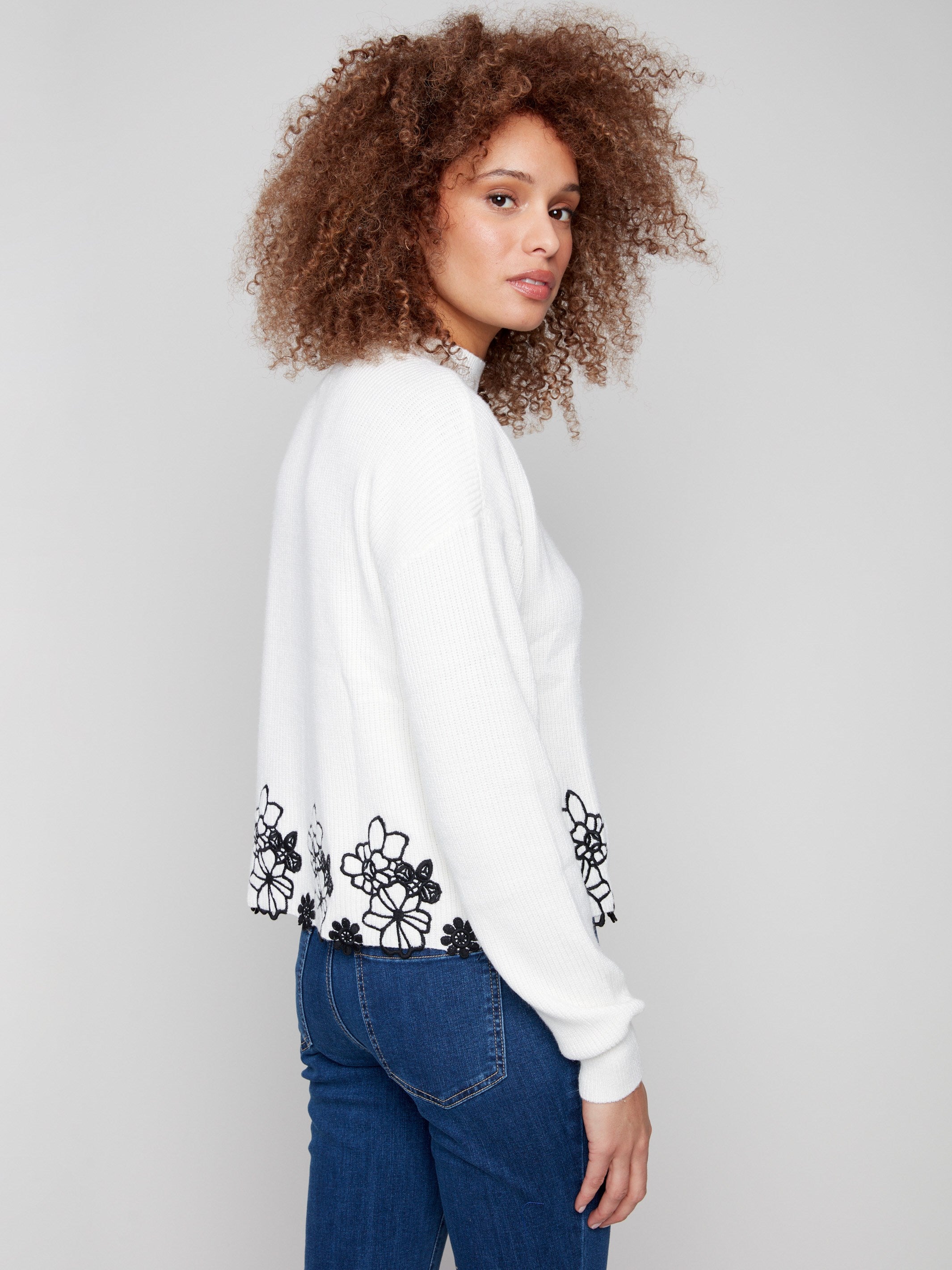 Mock Neck Sweater With Floral Lace Hem - Ecru