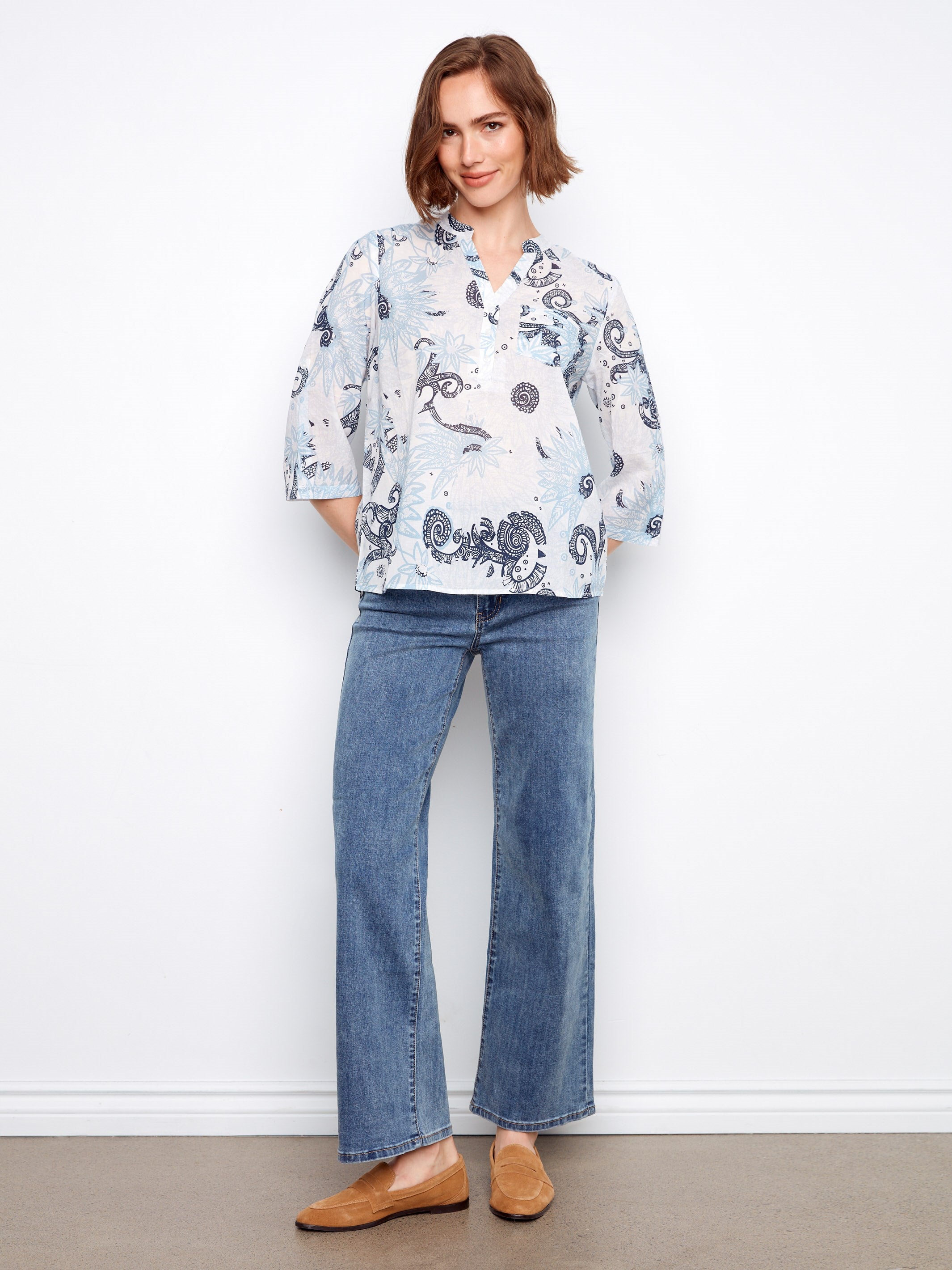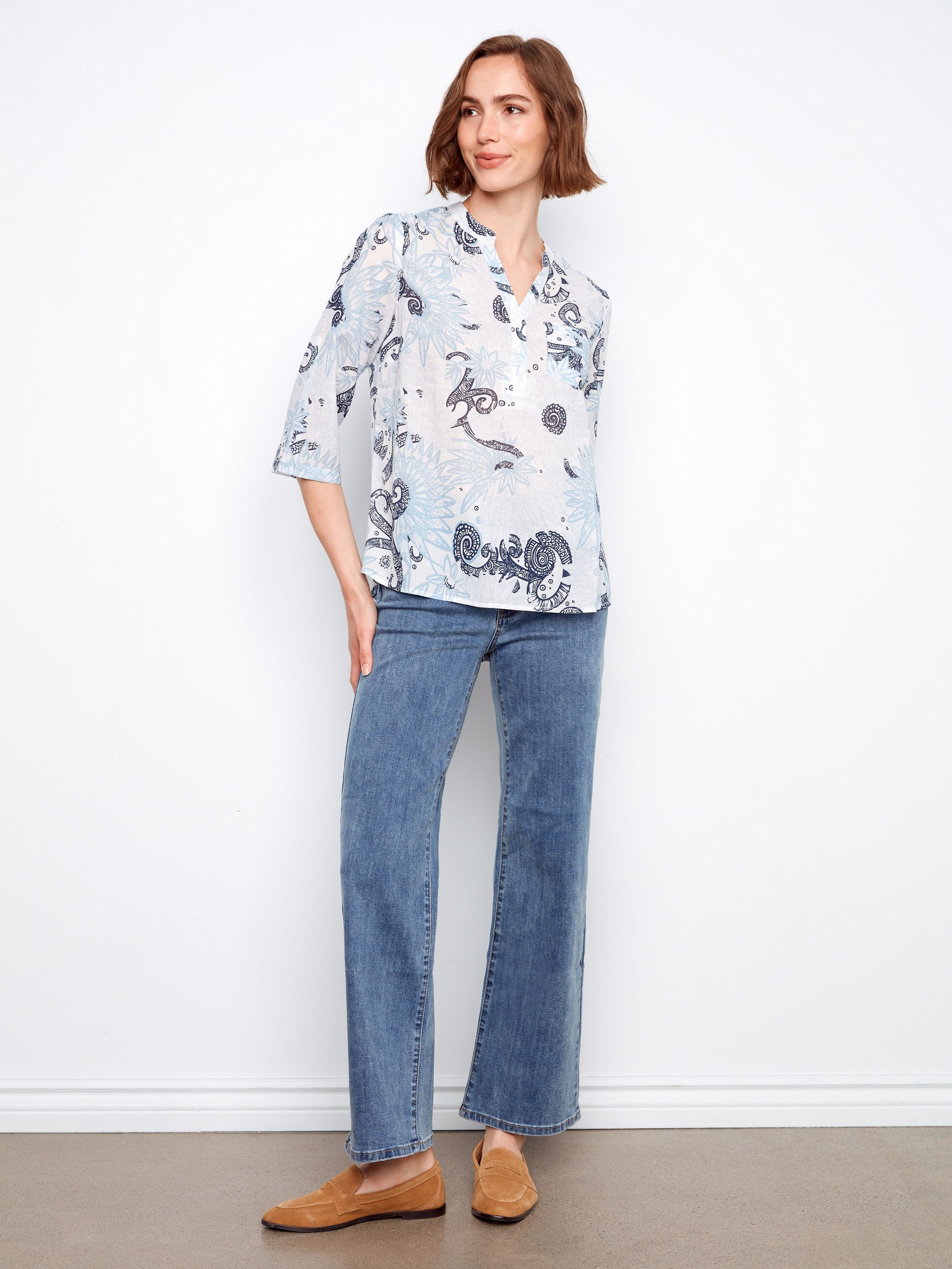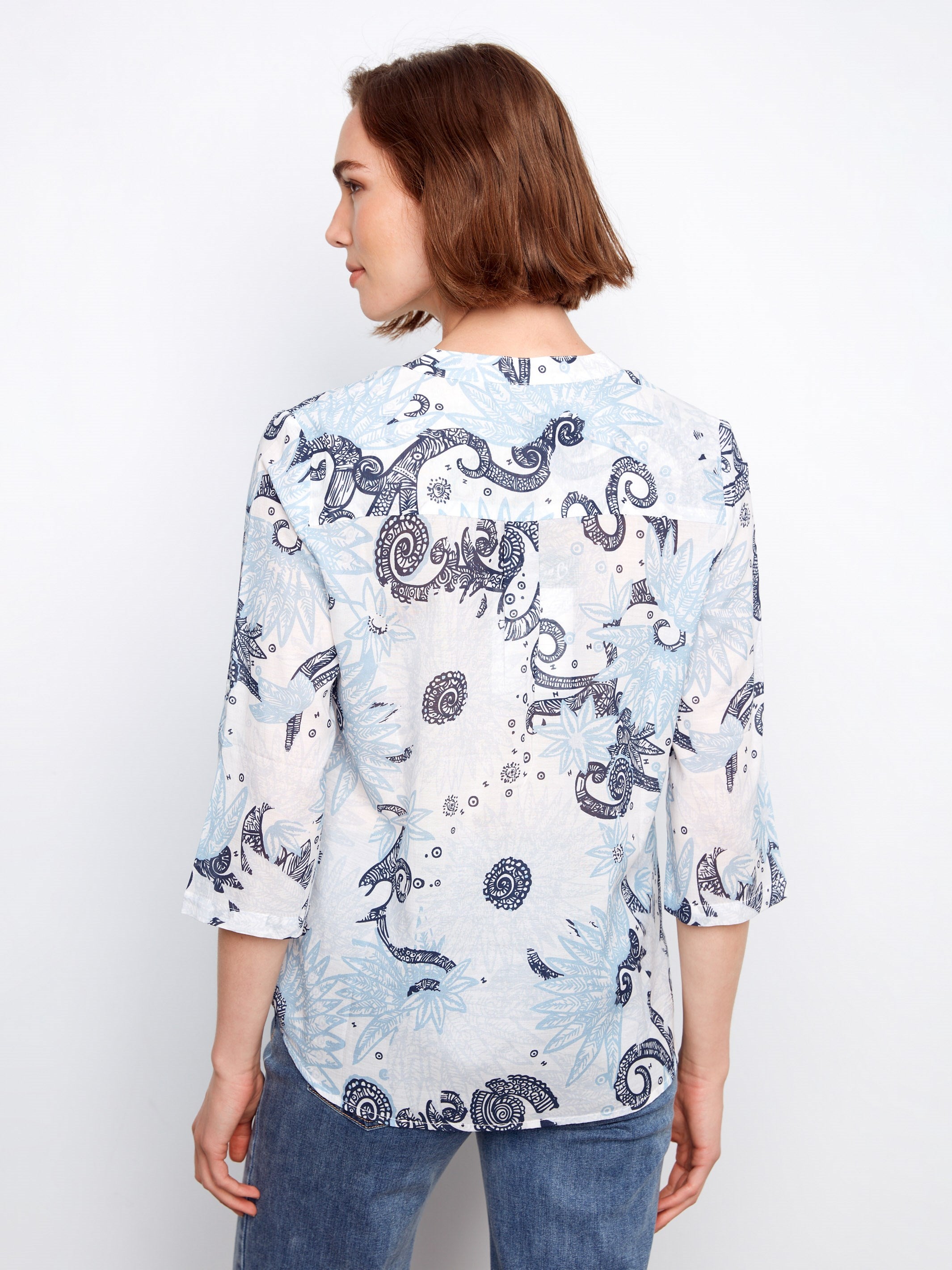 Discover the allure of our feather-inspired pattern blouse, a perfect fusion of style and everyday functionality. With its Henley neckline and breathable cotton fabric, this piece promises ultimate comfort for any occasion. Its versatile relaxed fit makes it ideal for layering or wearing on its own, ensuring you stay trendy from dawn to dusk. Elevate your wardrobe with this indispensable fashion staple!