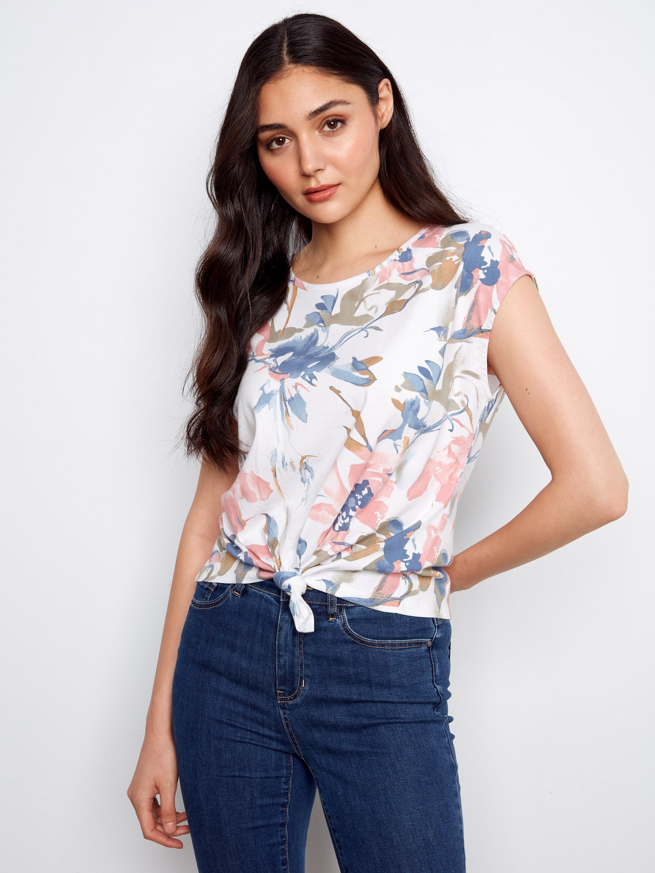 Unleash your inner artist with this exquisite floral top, adorned with a charming front knot. The delicate pastel hues are inspired by nature's own palette, making it an essential addition to any spring wardrobe. Experience the perfect blend of style and comfort, and elevate your fashion statement this season with this captivating piece.
