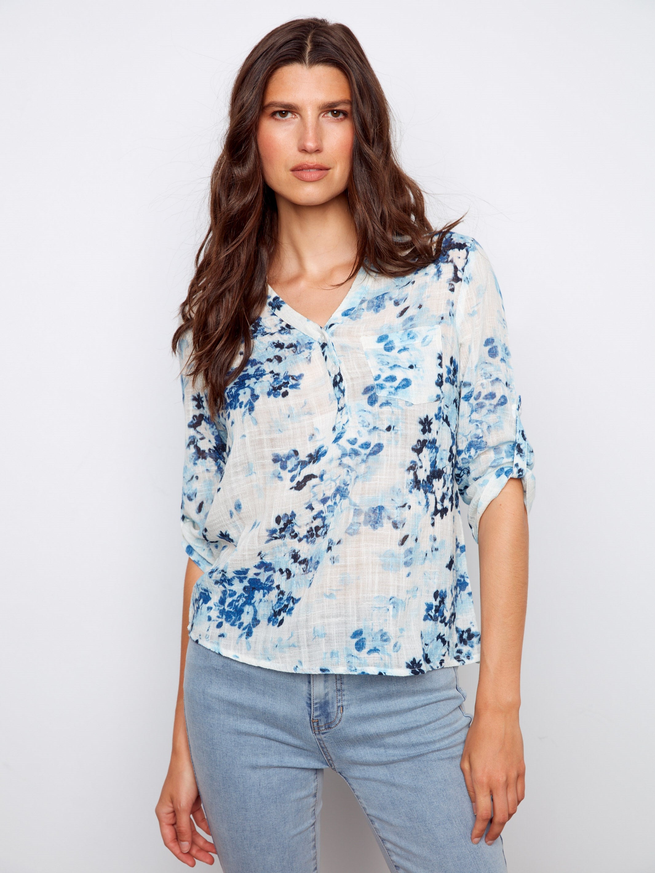A vibrant Printed Cotton Gauze Half in Meadow brings a lively update to your wardrobe. The floral pattern adds a fresh feel, and the breathable fabric keeps you comfortable. Perfect for casual outings, it features adjustable roll-up sleeves and a chest patch pocket for a stylish look. An essential piece for any fashion-forward wardrobe!