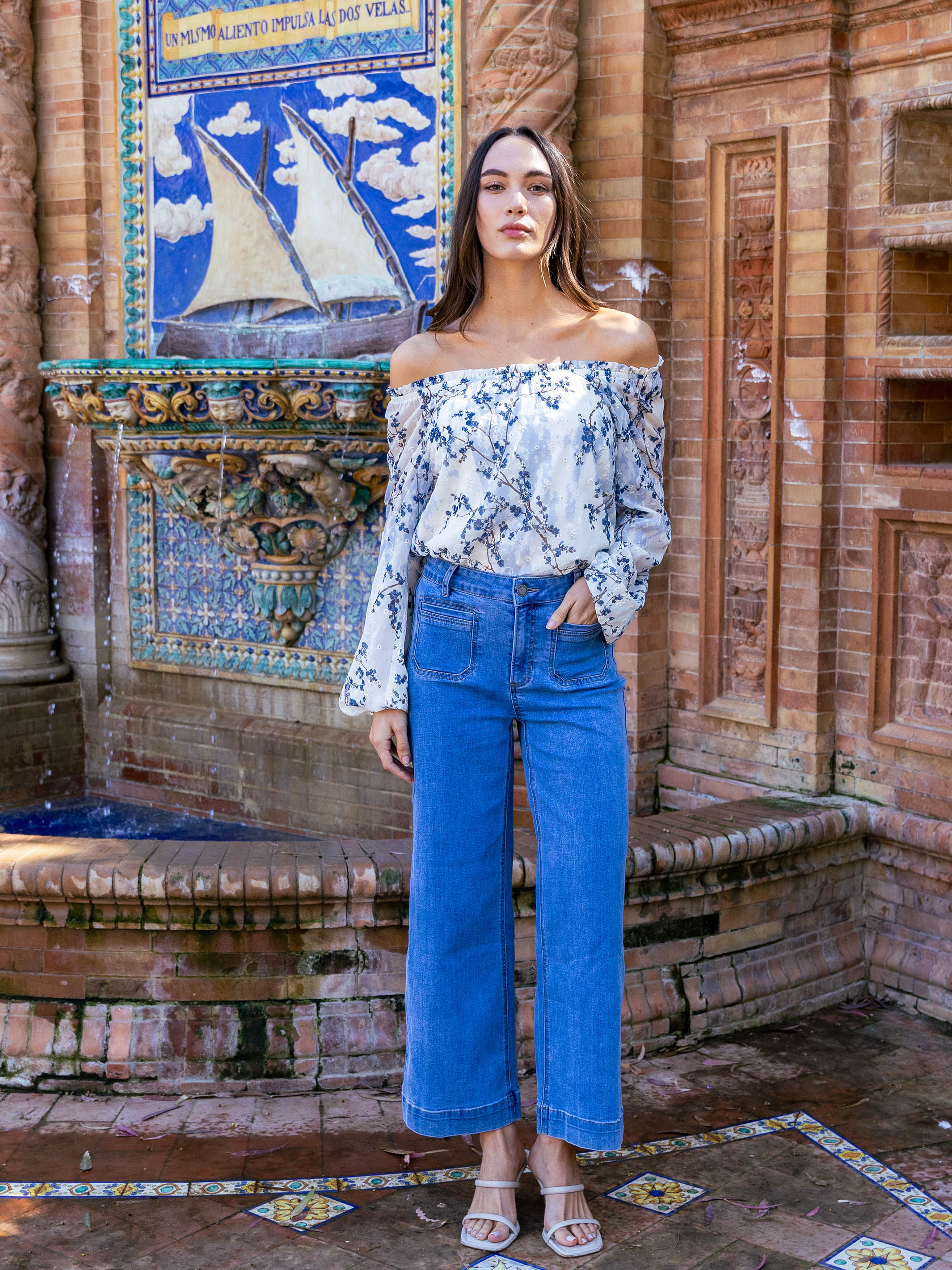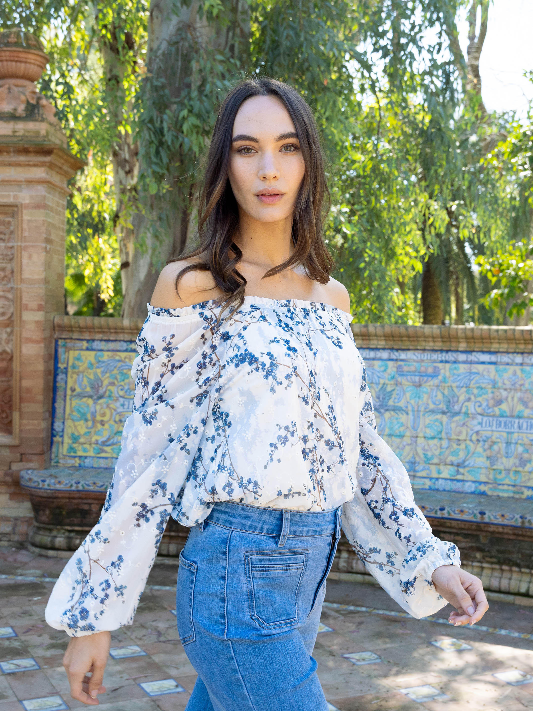 An off-shoulder blouse with a captivating floral print and intricate eyelet details brings a sense of springtime romance. The balloon sleeves add elegance to the look. Ideal for a garden party or a casual outing, it pairs beautifully with jeans or a skirt, lending a feminine vibe to any outfit.