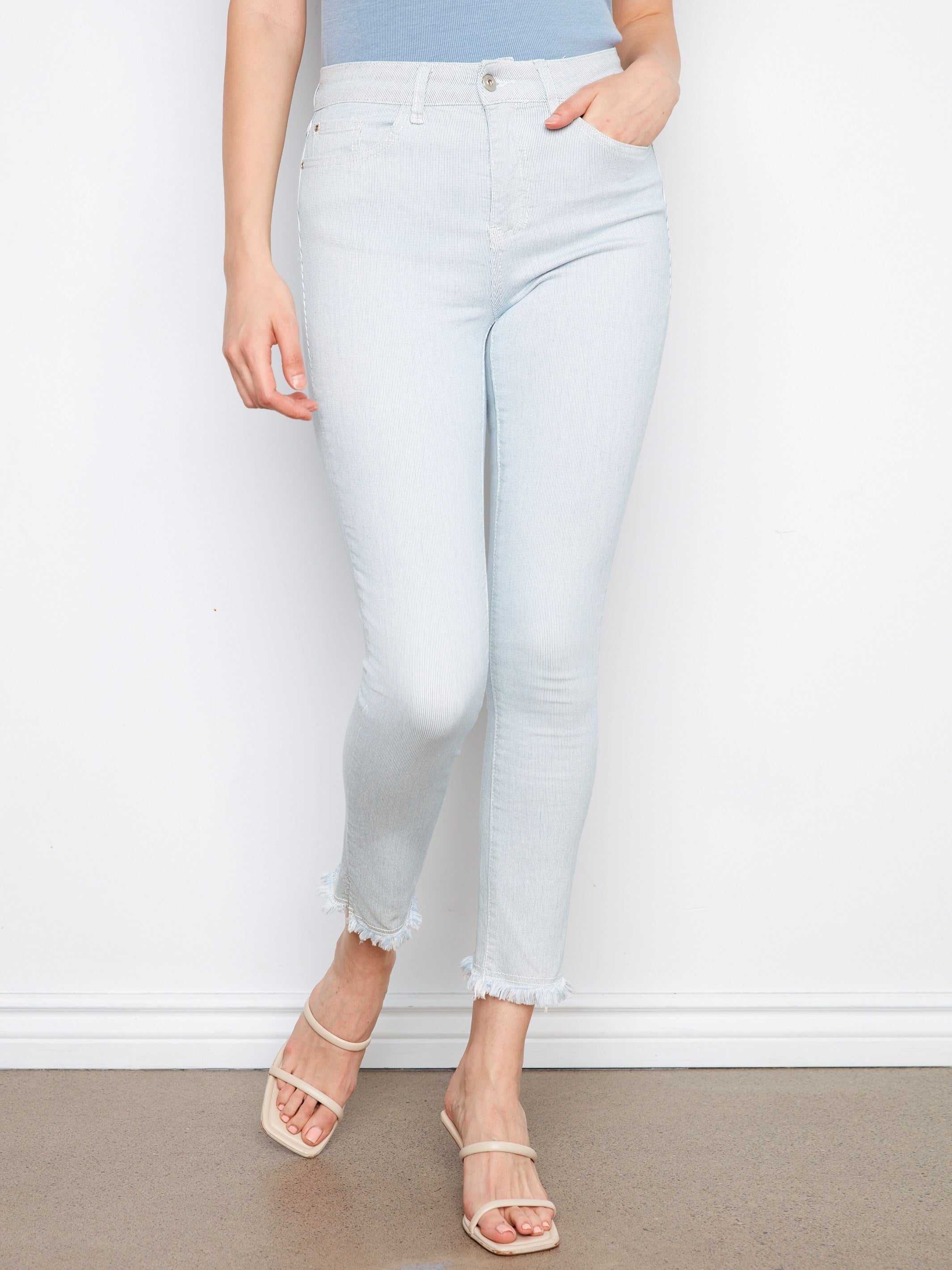 Add a playful touch to your spring wardrobe with our slim leg twill pants, featuring pale blue yarn-dyed stripes. Perfectly cropped with a regular rise, they pair effortlessly with a t-shirt or blouse. These pants offer the perfect combination of style and comfort, keeping you looking flawless wherever you go.