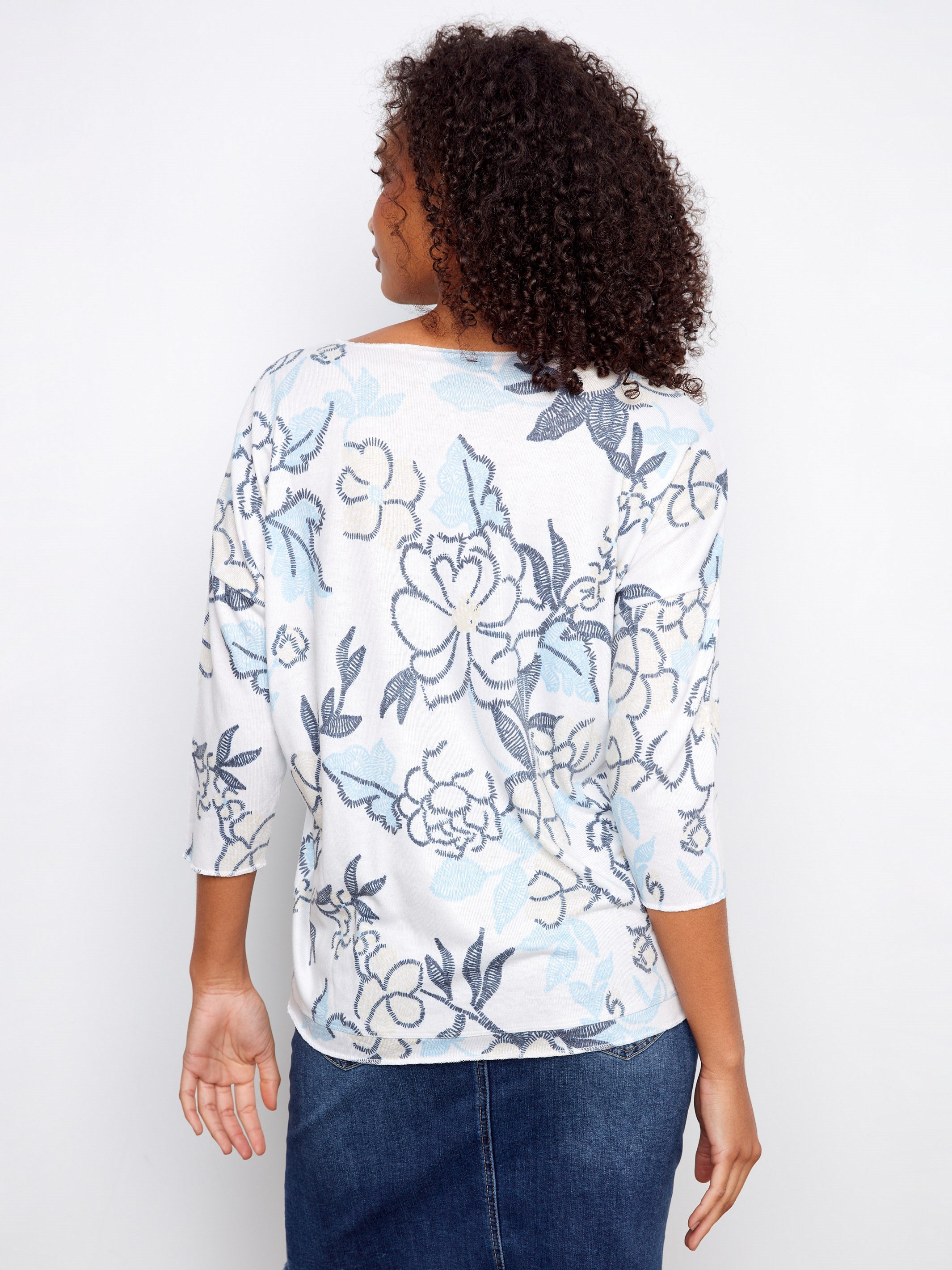 Its fabric gently stretches, offering a soft touch. The 3/4 sleeves bring a casual yet chic vibe. The delightful 'Windflower' color is perfect for a breezy, stylish day.