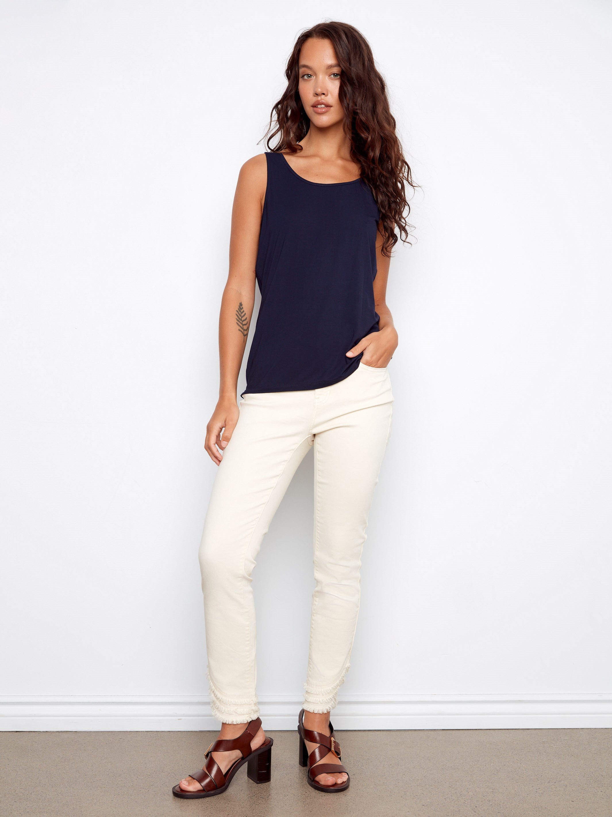 Enhance your spring wardrobe versatility with this sleek navy blue cami made from bamboo fabric. Its reversible design lets you switch between a scoop and a V-neckline, allowing for a smooth transition from day to night. Whether worn alone or as a layering piece, this cami offers simple sophistication.