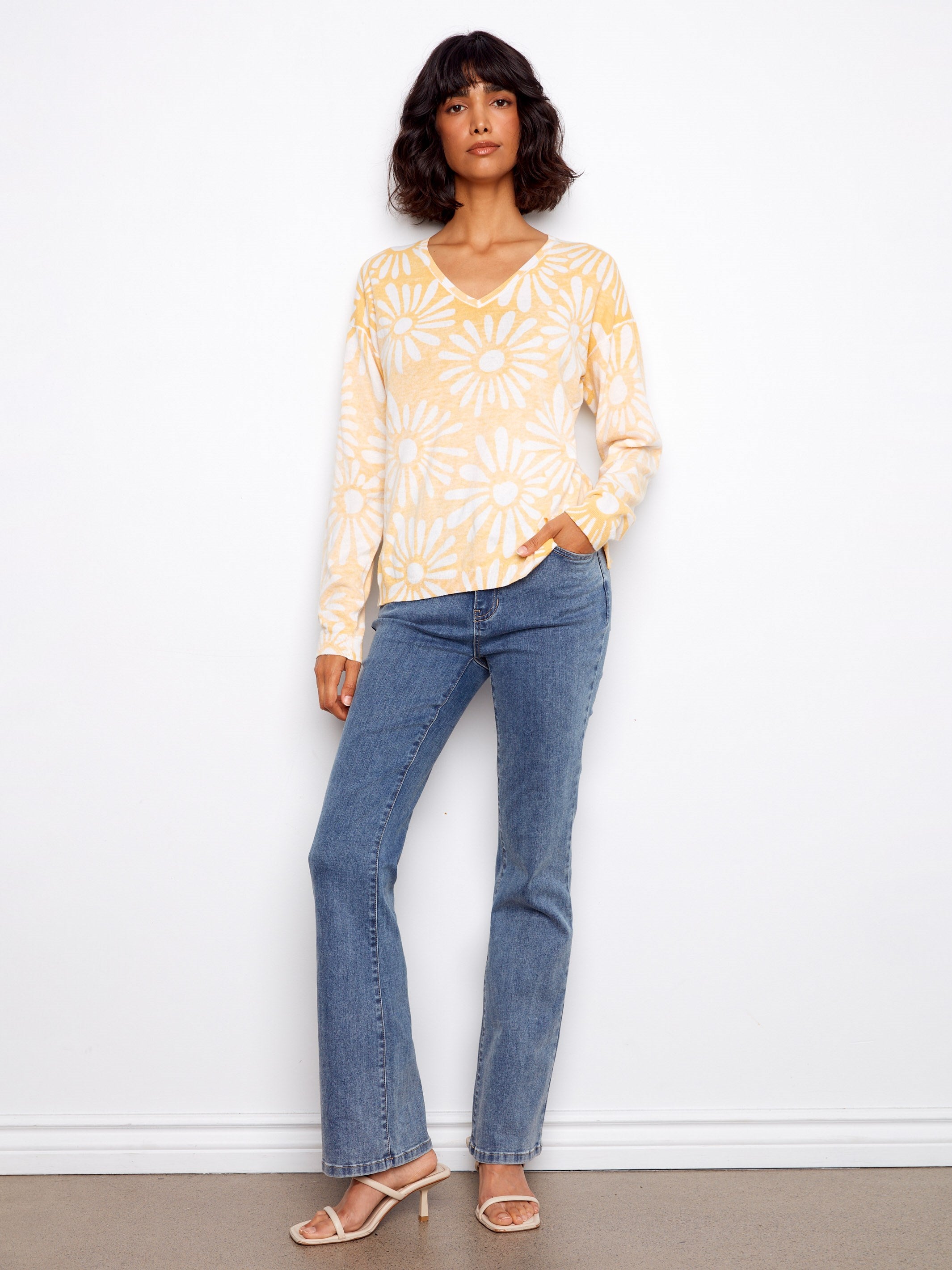 Refresh your spring wardrobe with this yellow reversible sweater, detailed with white floral prints. Designed with a flattering V-neck and an easy, relaxed feel, it offers two looks in one. Soft and breathable, it is perfect for leisurely days and casual outings, making it a must-have for the season.