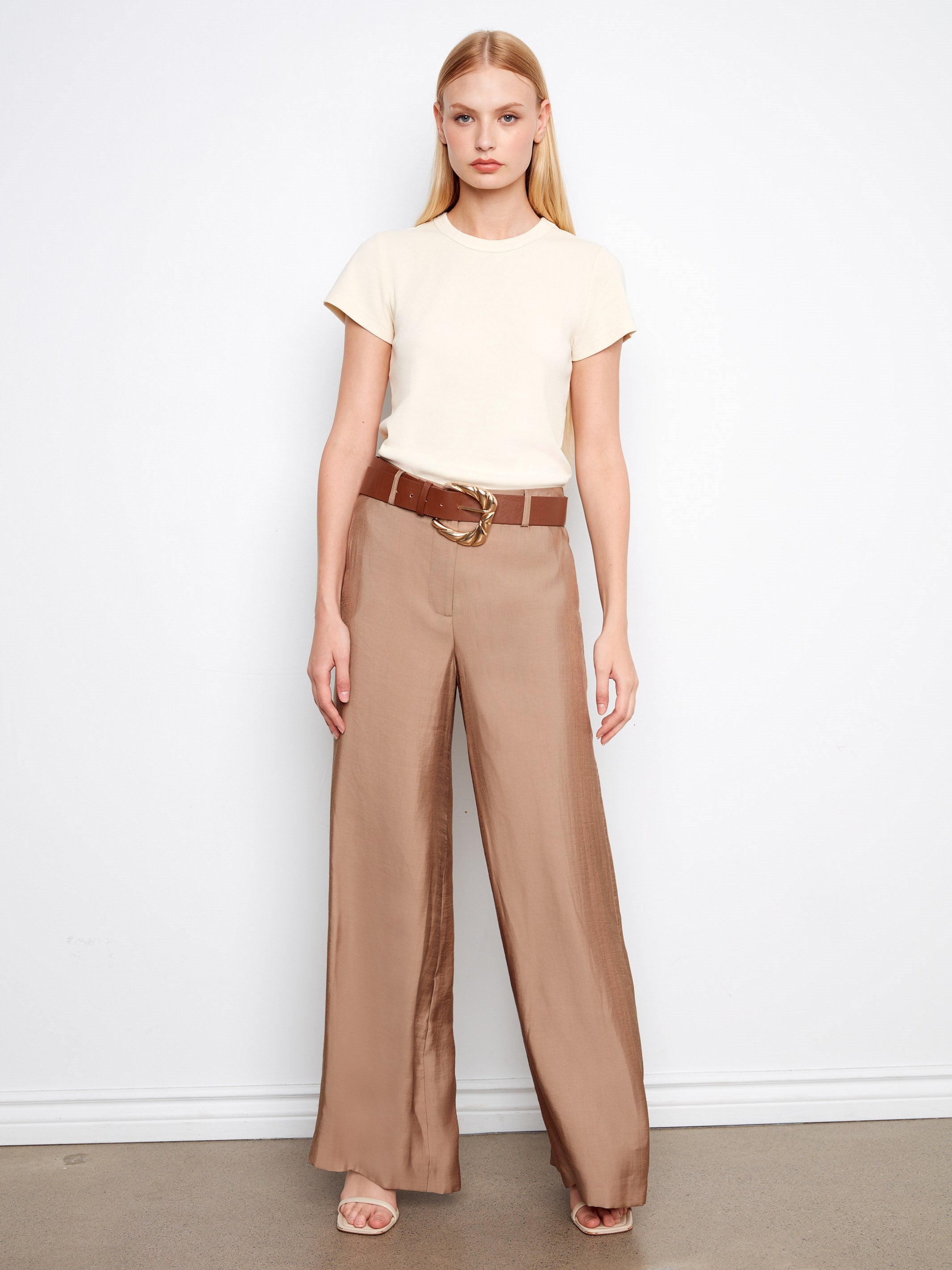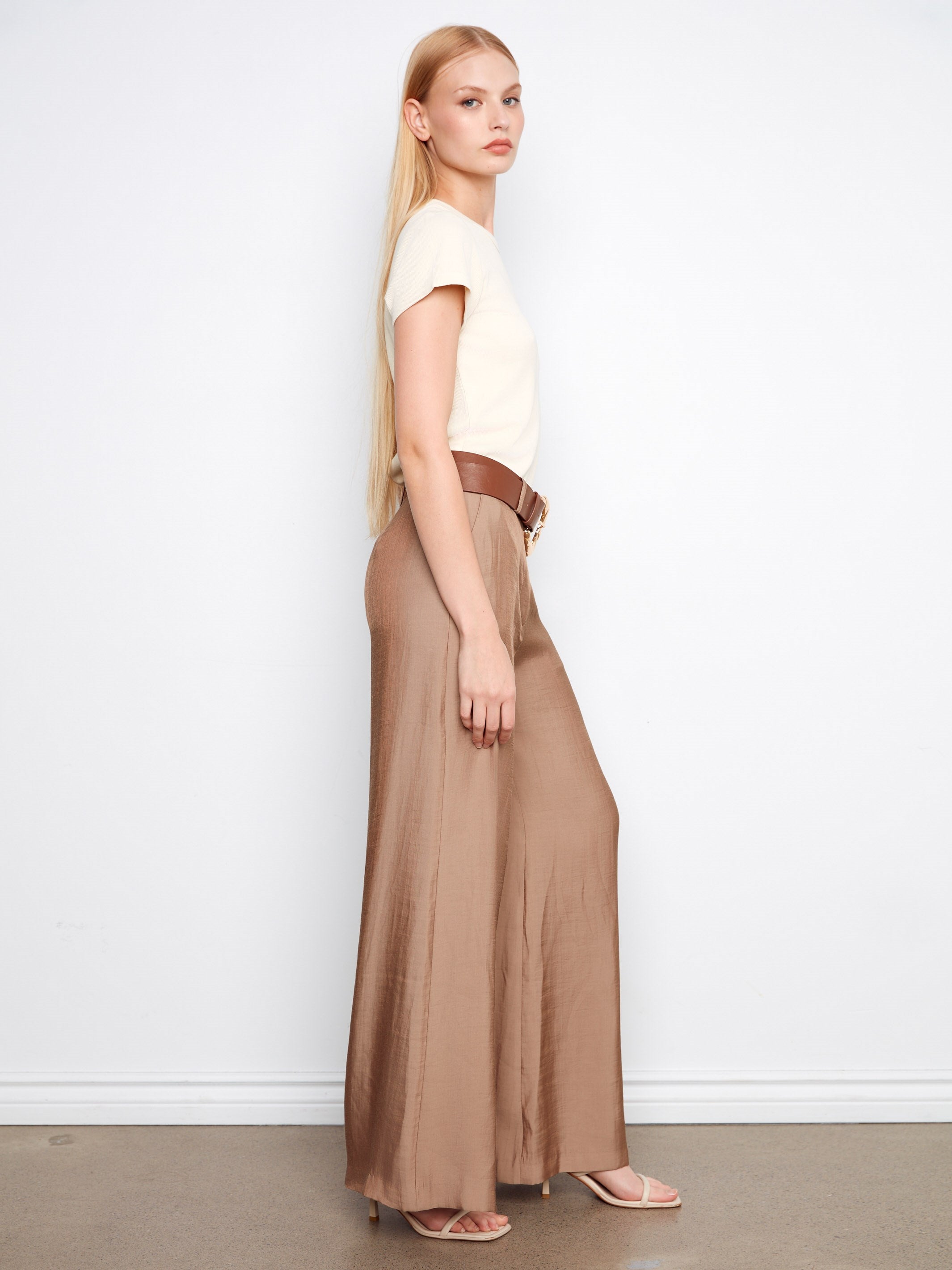 Discover elegance and versatility with our Satin Belted Wide Leg Pants in a chic sand brown color. These flowing pants are perfect for elevating your spring wardrobe, seamlessly transitioning from a sophisticated office ensemble to a classy dinner date outfit. Effortlessly enhance your style with these must-have pants that promise style and comfort.