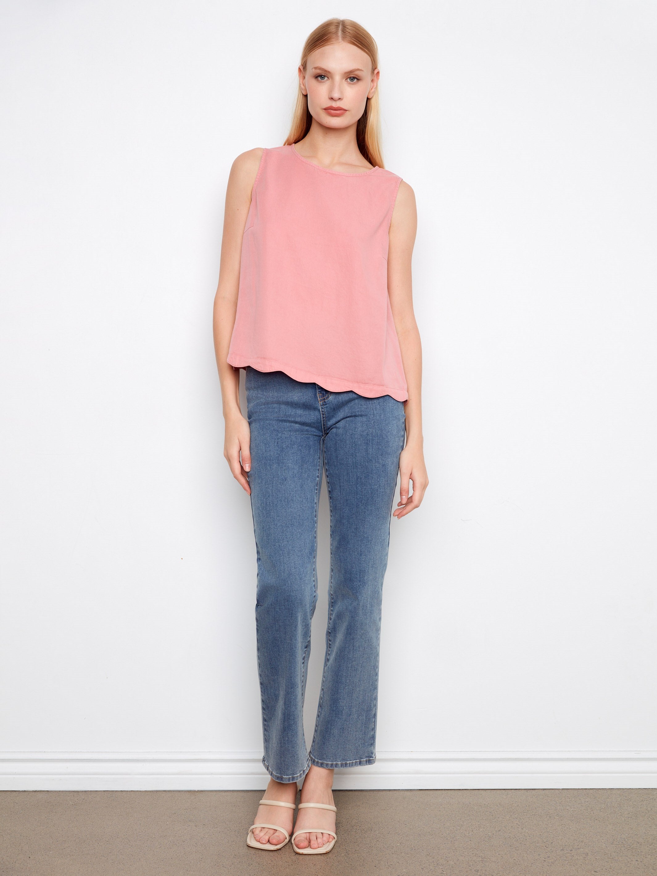 We love how this sleeveless style feels effortlessly refined for warm-weather days. The fluid fabric drapes beautifully, while the scalloped edge and back button details add a thoughtful finishing touch. It’s a versatile staple that pairs perfectly with everything from tailored pants to relaxed denim.