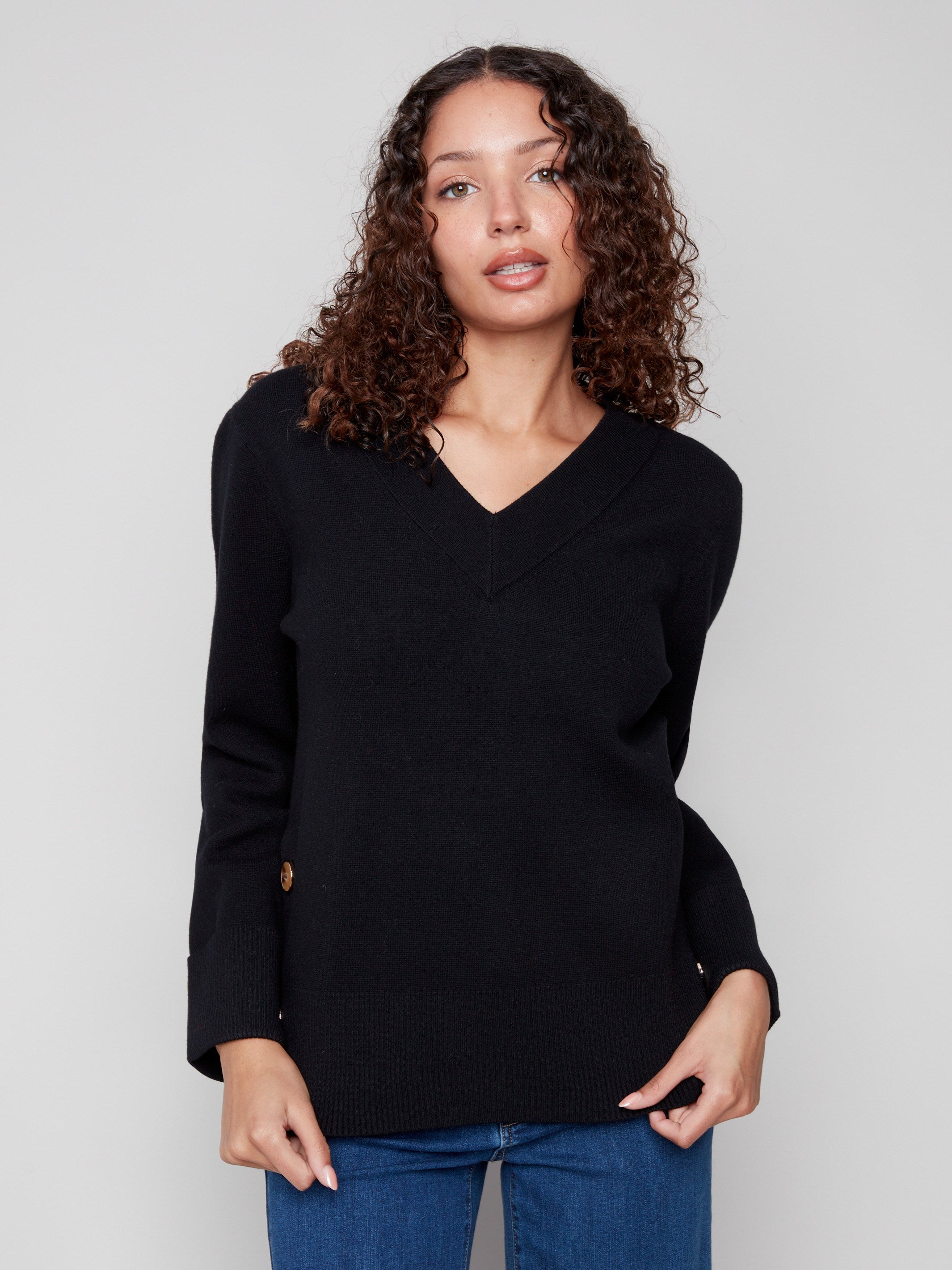 Wide Cuff V-Neck Sweater With Side Buttons - Black