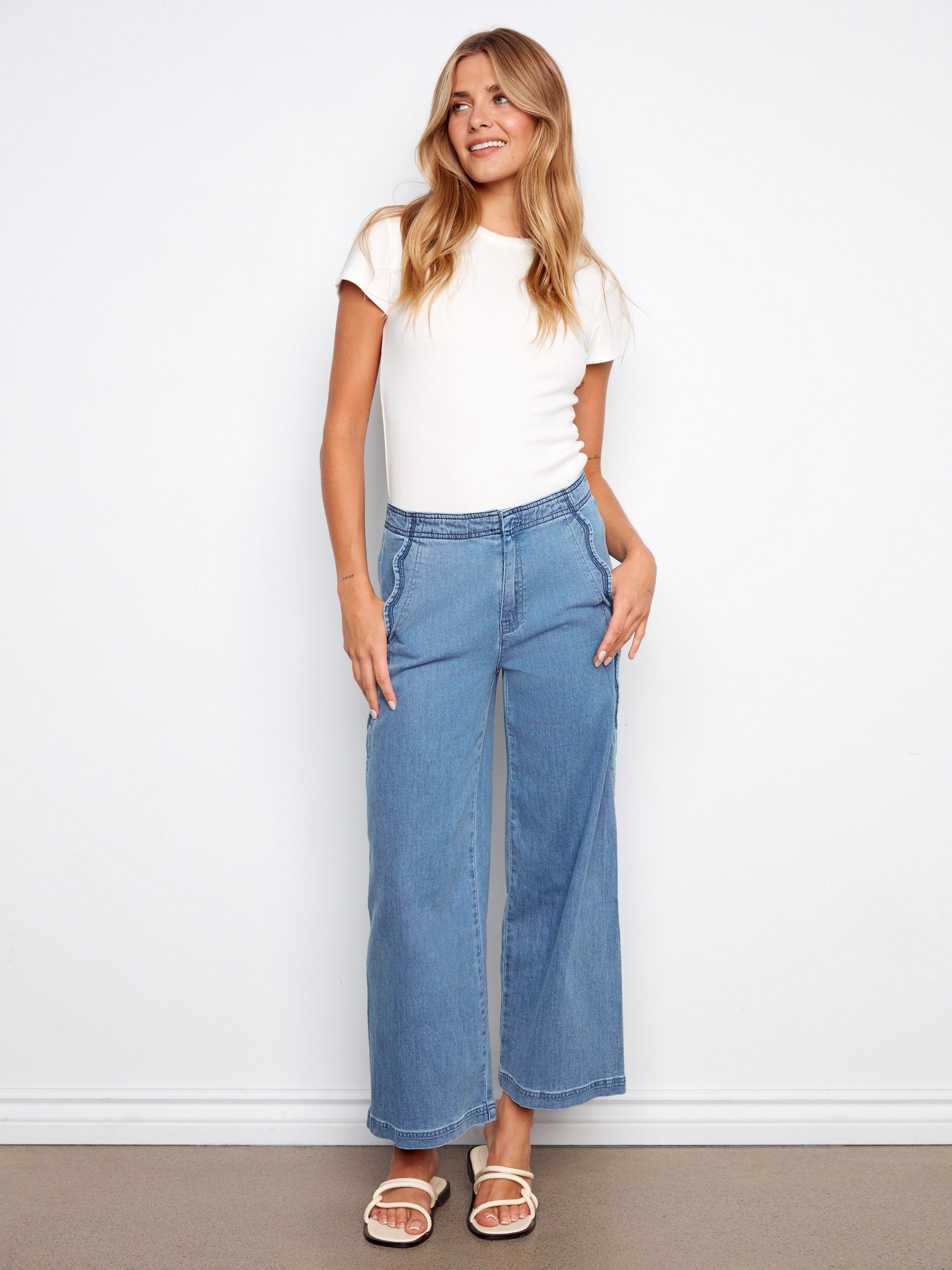 Step up your fashion game with these wide-leg jeans in a soothing soft blue, adorned with playful scalloped edges for a unique twist on a timeless classic. The chic cropped length infuses a modern flair, while the comfortable fit ensures all-day wearability. These jeans are a must-have staple for your spring wardrobe, effortlessly pairing with your favorite tops and accessories.
