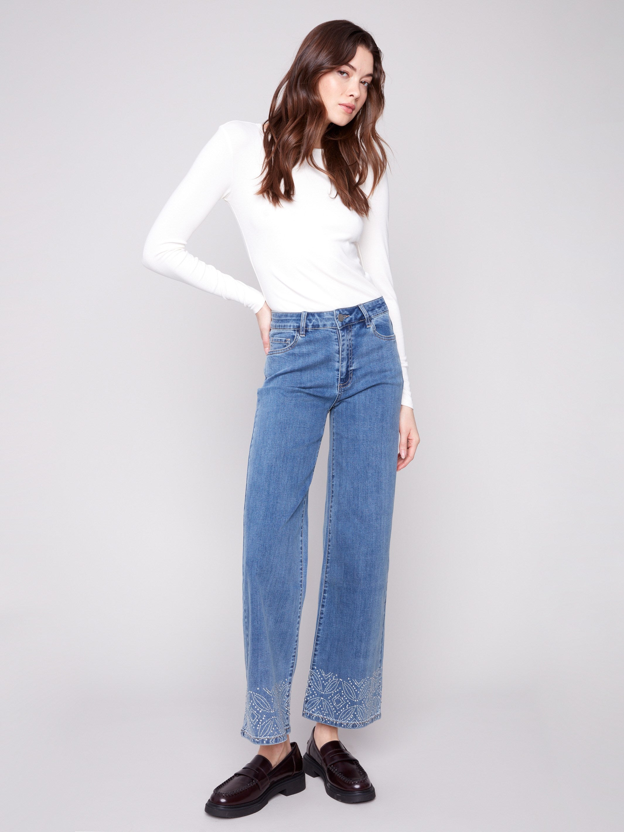 Wide Leg Jeans With Studded Hem - Medium Blue
